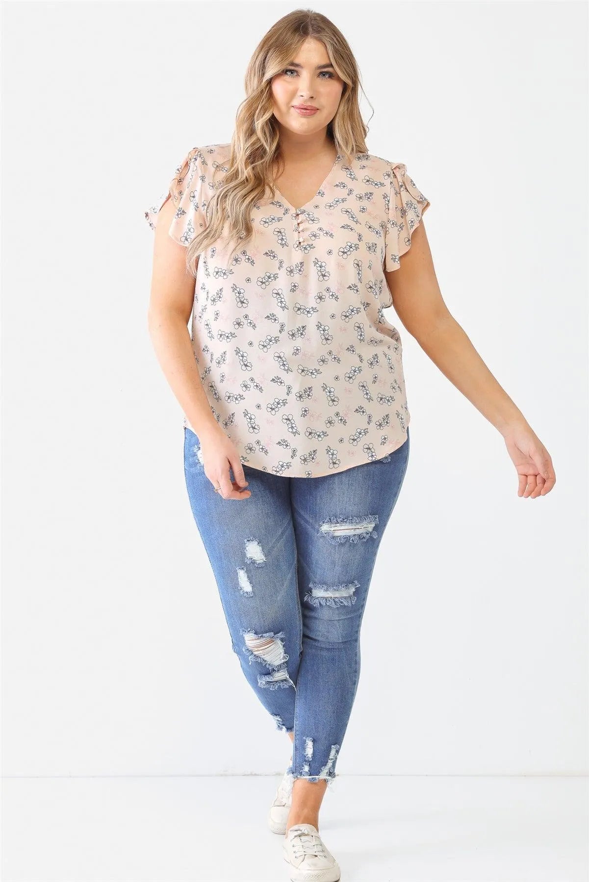 Junior Plus Taupe Flower Print Button-Up V-Neck Short Sleeve Top /1-1-1