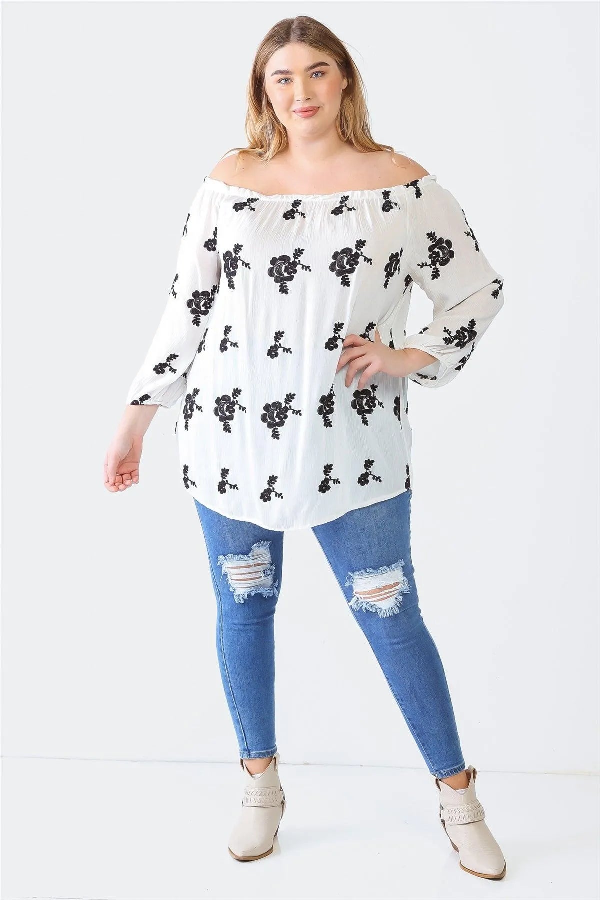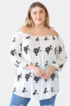 Junior Plus White & Black Flower Print Off-The-Shoulder Midi Sleeve Top /1-1-1