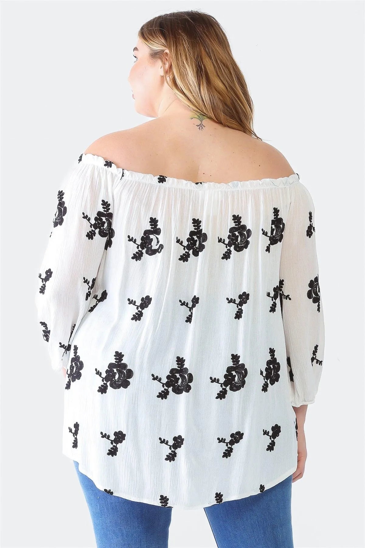 Junior Plus White & Black Flower Print Off-The-Shoulder Midi Sleeve Top /1-2-2