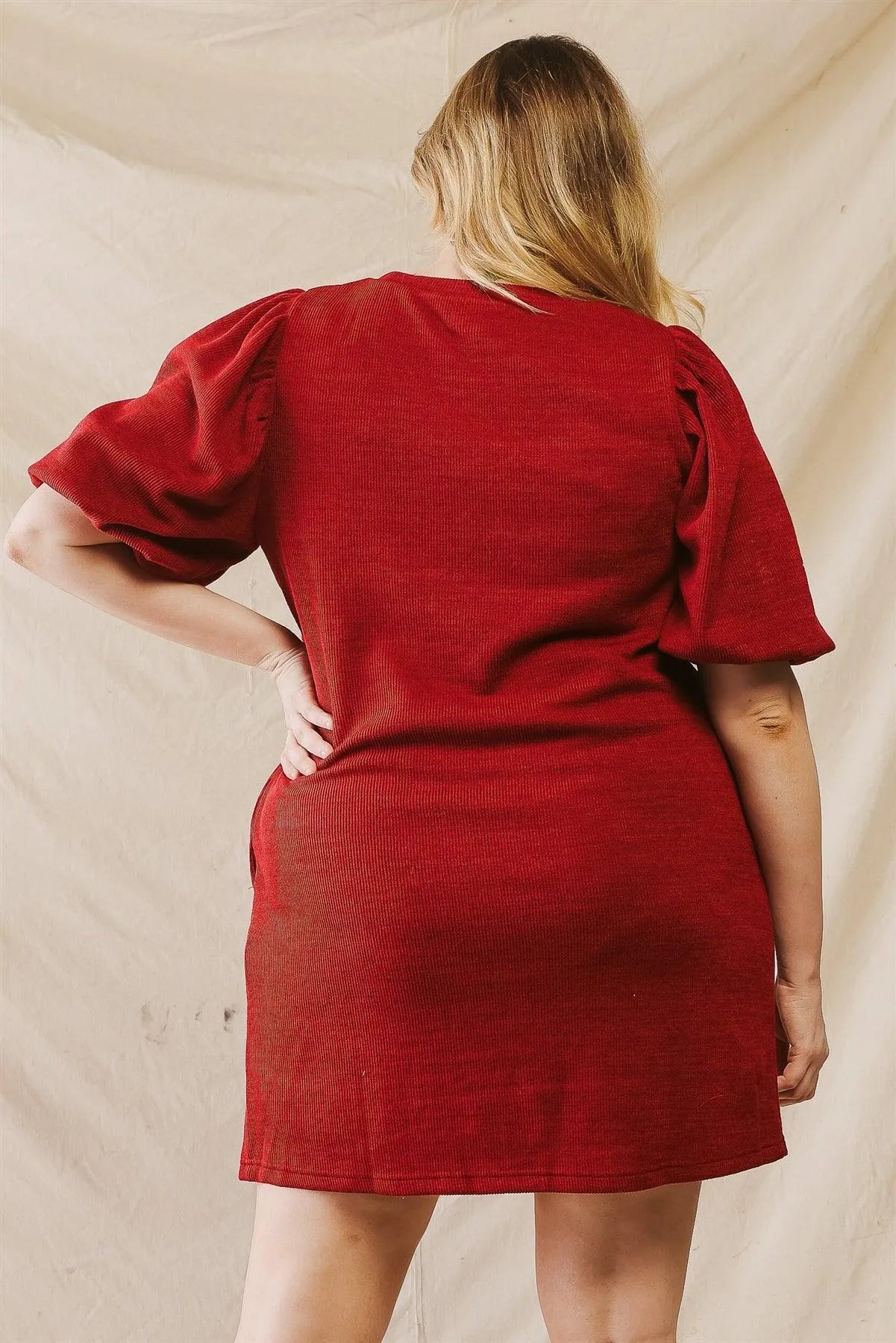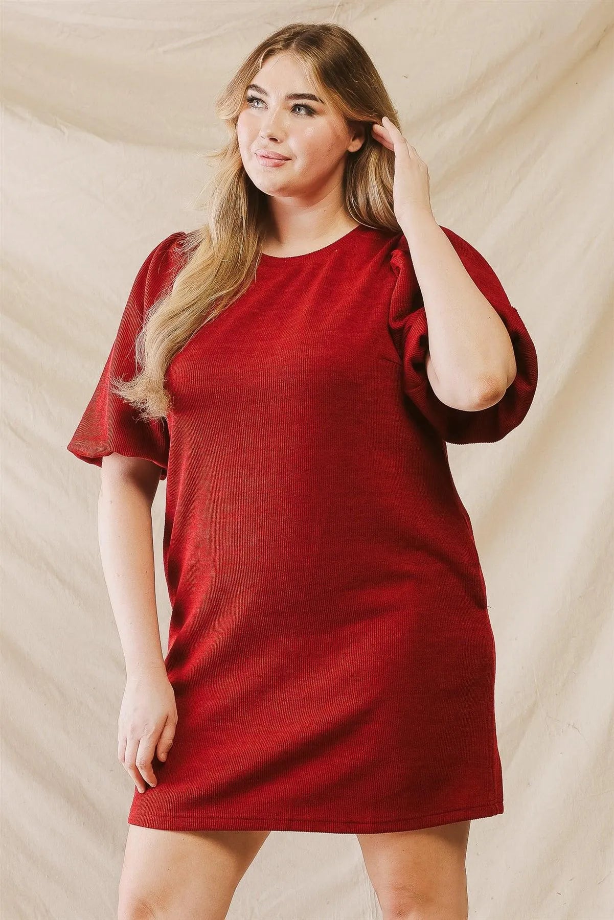 Junior Plus Wine Ribbed Puff Balloon Short Sleeve Two Pocket Mini Dress
