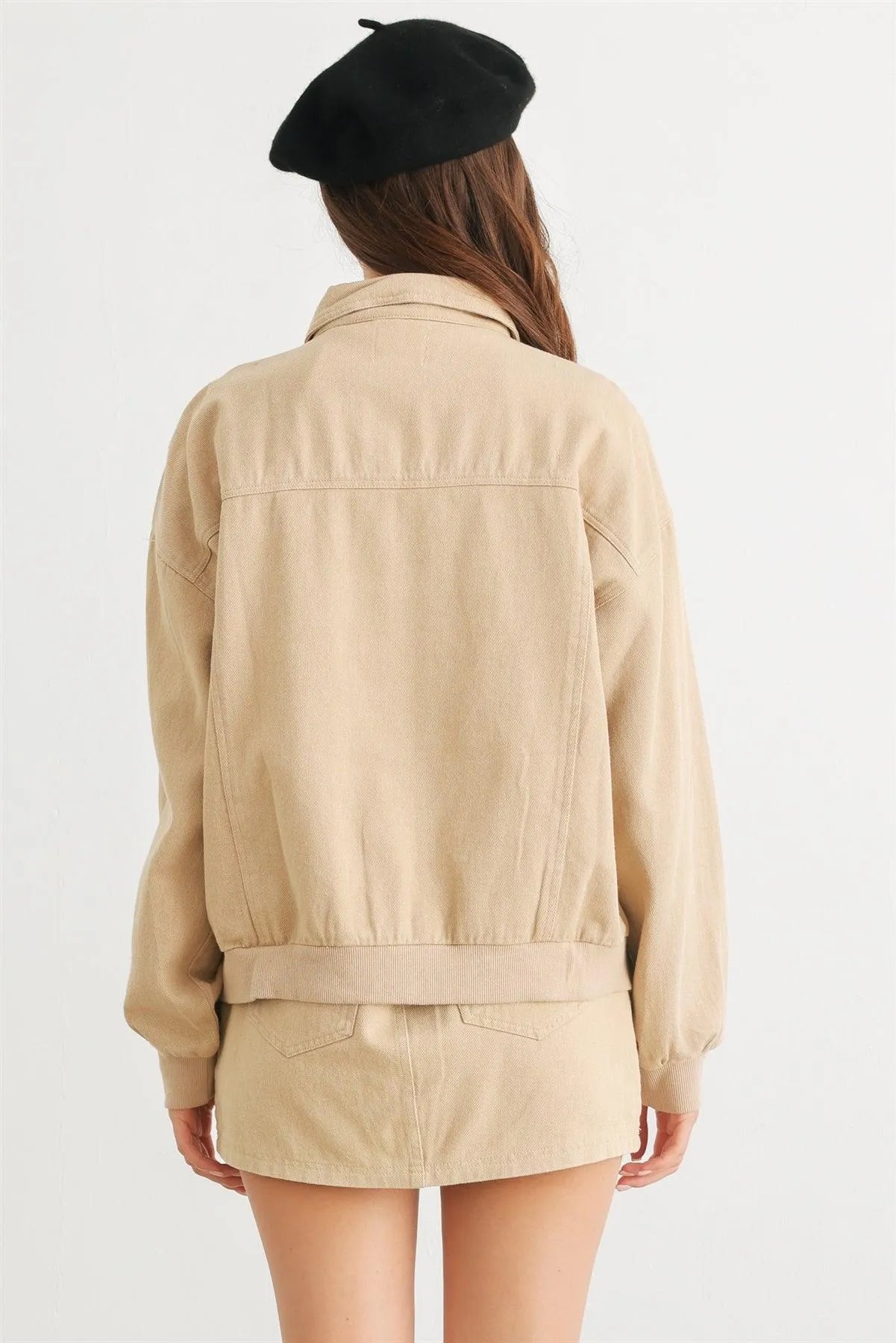 🖤 Item Features: Khaki, solid color, denim, cotton material, long sleeves, collared neckline, two pockets, front zip-up closure, elasticized hem jacket, four pockets, mid rise, five belt loops, front hidden zip-up & buttons closure, mini length skirt, non-stretchy, not see through, unlined, casual, cute, stylish, must-have