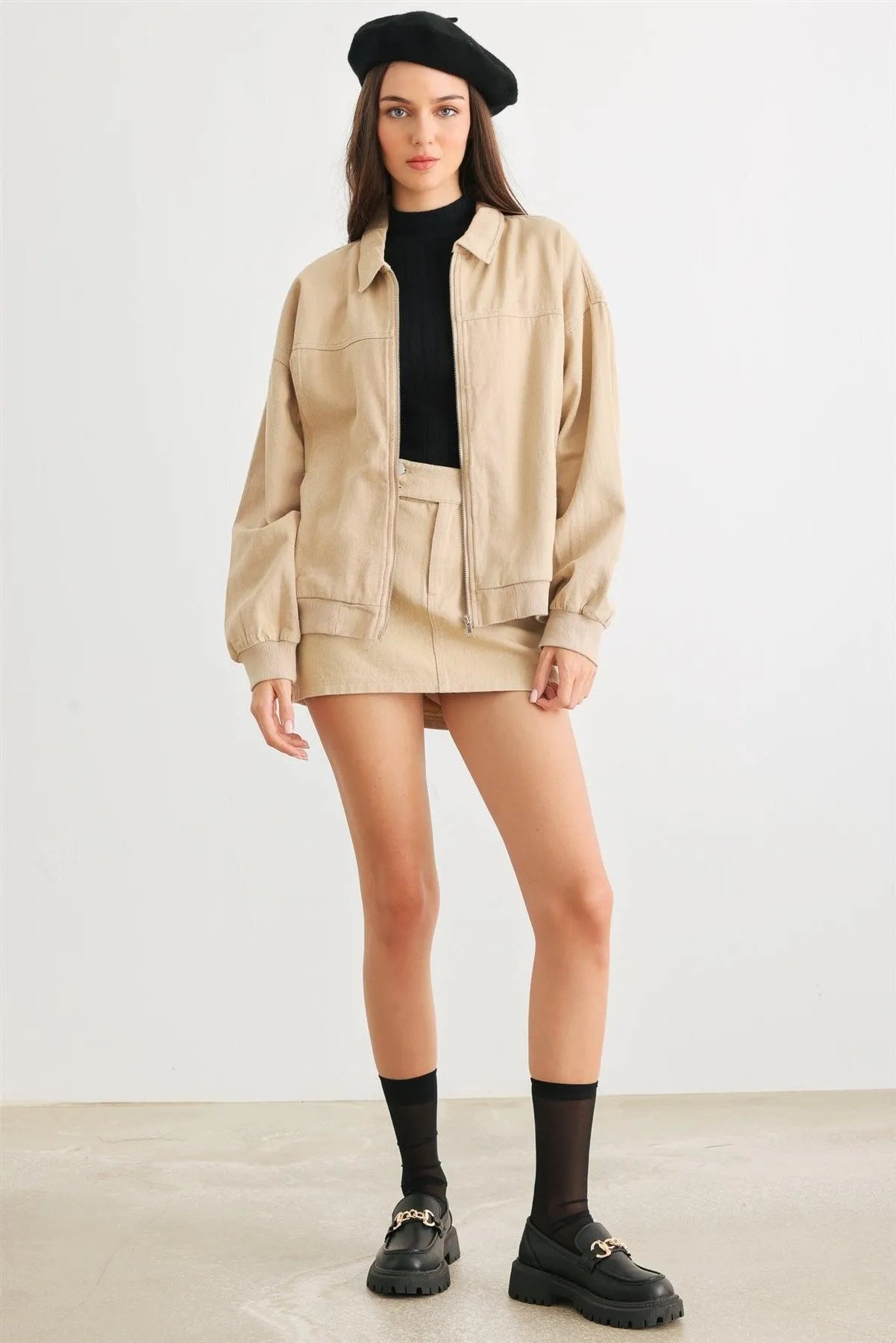 Khaki Cotton Zip-Up Jacket & Mid Rise Mini Skirt Set /1-2-2-1