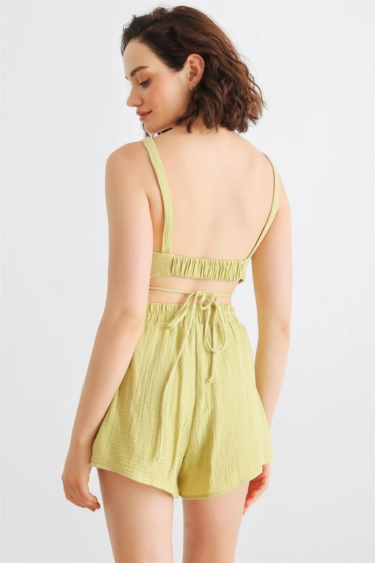 🖤 Item Features: Kiwi, cotton material, textured, sleeveless, open back, drawstring hem, cropped length top, elasticized waistband, high waist, lined shorts, semi-stretchy, not see through, lined, casual, cute, girlish, stylish