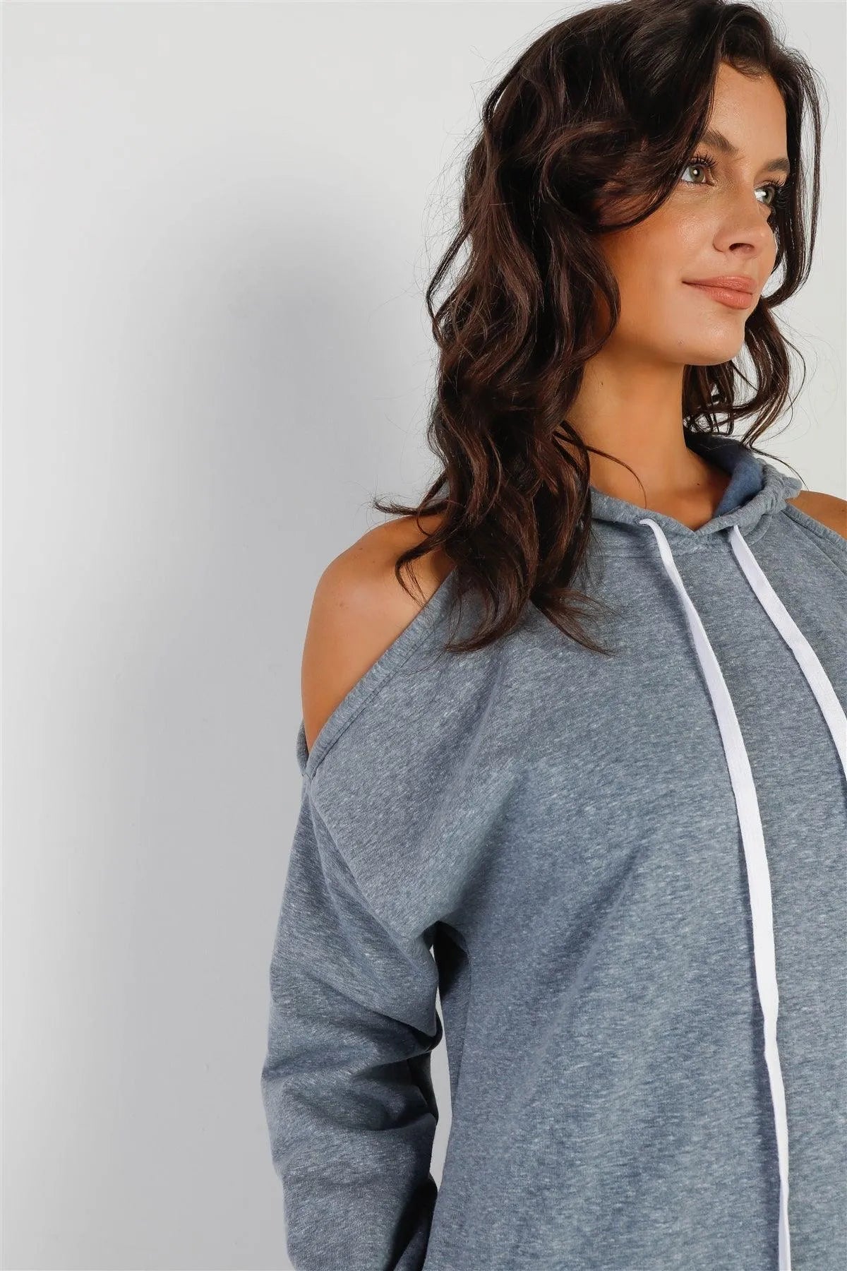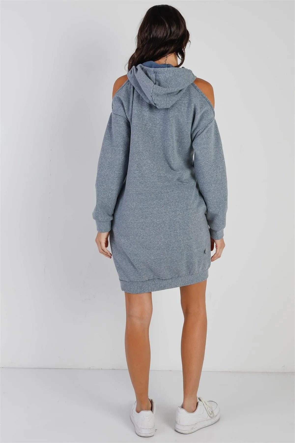 🖤 Stay cozy and chic in this Light Blue Cold Shoulder Hooded Dress. Hood features adjustable drawstrings, sleeves are cuffed and hemmed, and there are two side pockets. It's unlined and stretchy, making it perfect for everyday comfort. Definitely a cute and trendy addition to your wardrobe.