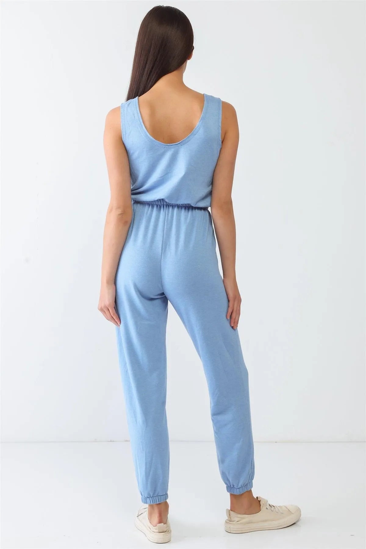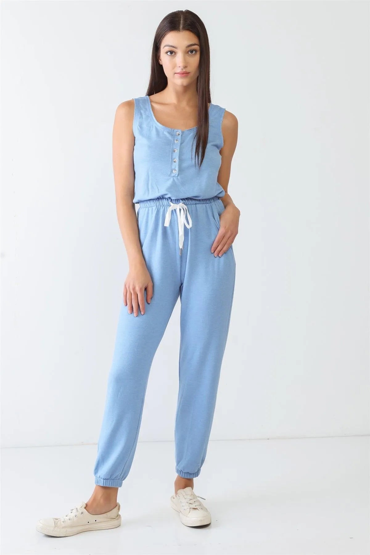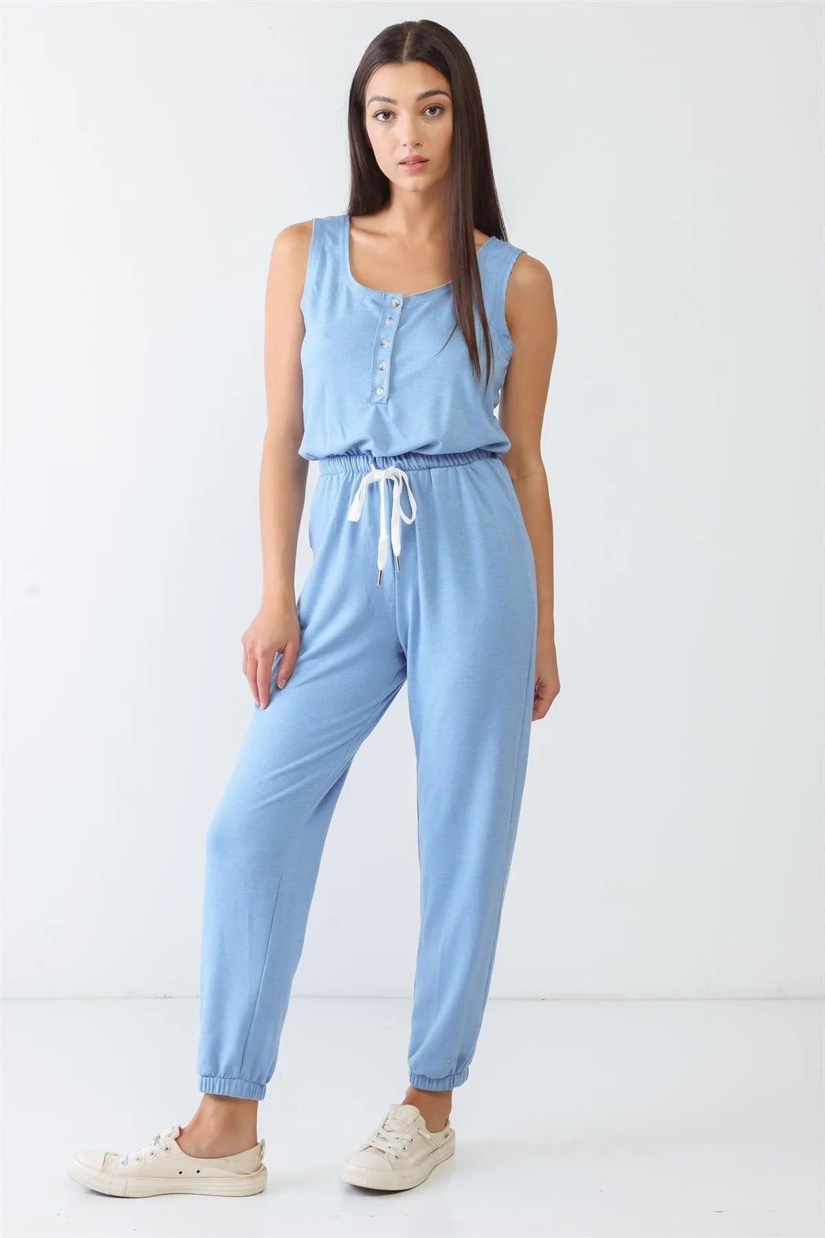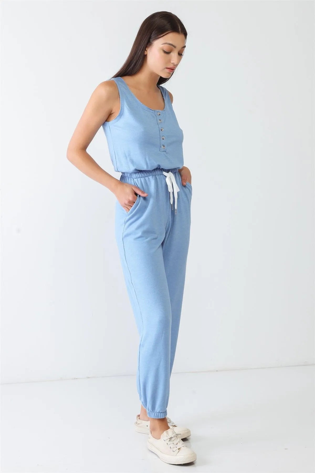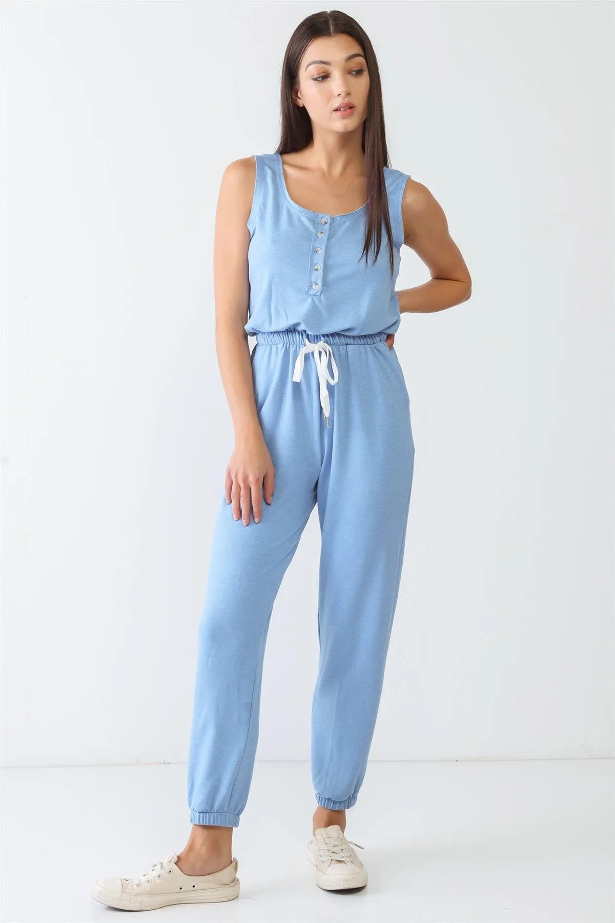 🖤 Get ready to jump into style with our light blue sleeveless jumpsuit! Featuring a round neckline, front button-up closure, and two convenient pockets, this casual and cozy piece can be dressed up or down. The elasticized waistband with adjustable drawstring ensures a comfortable fit, making this jumpsuit a cute and practical addition to your wardrobe.