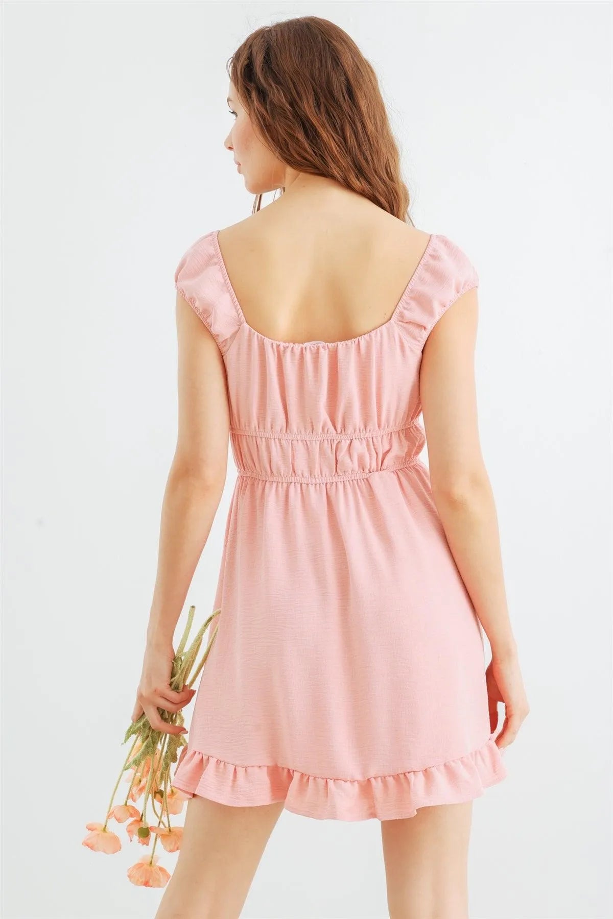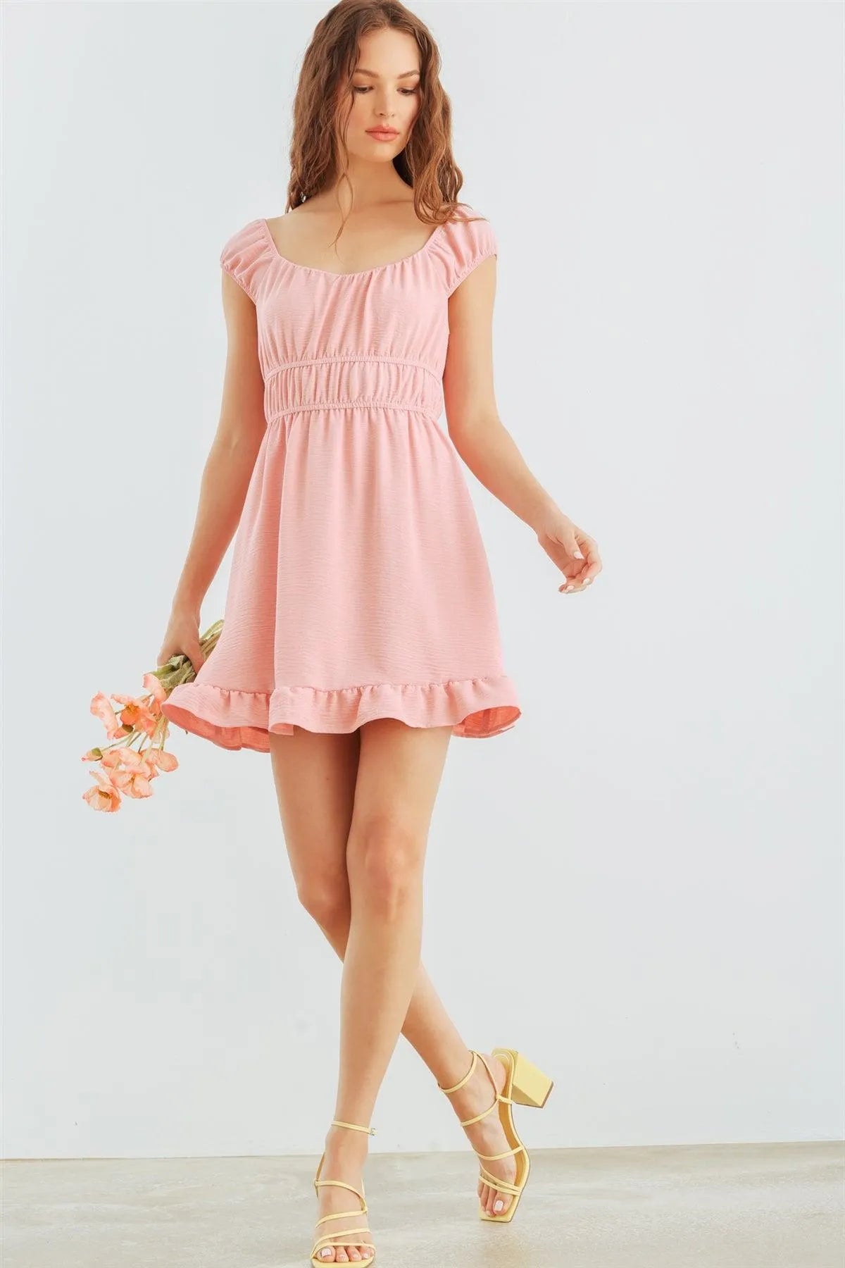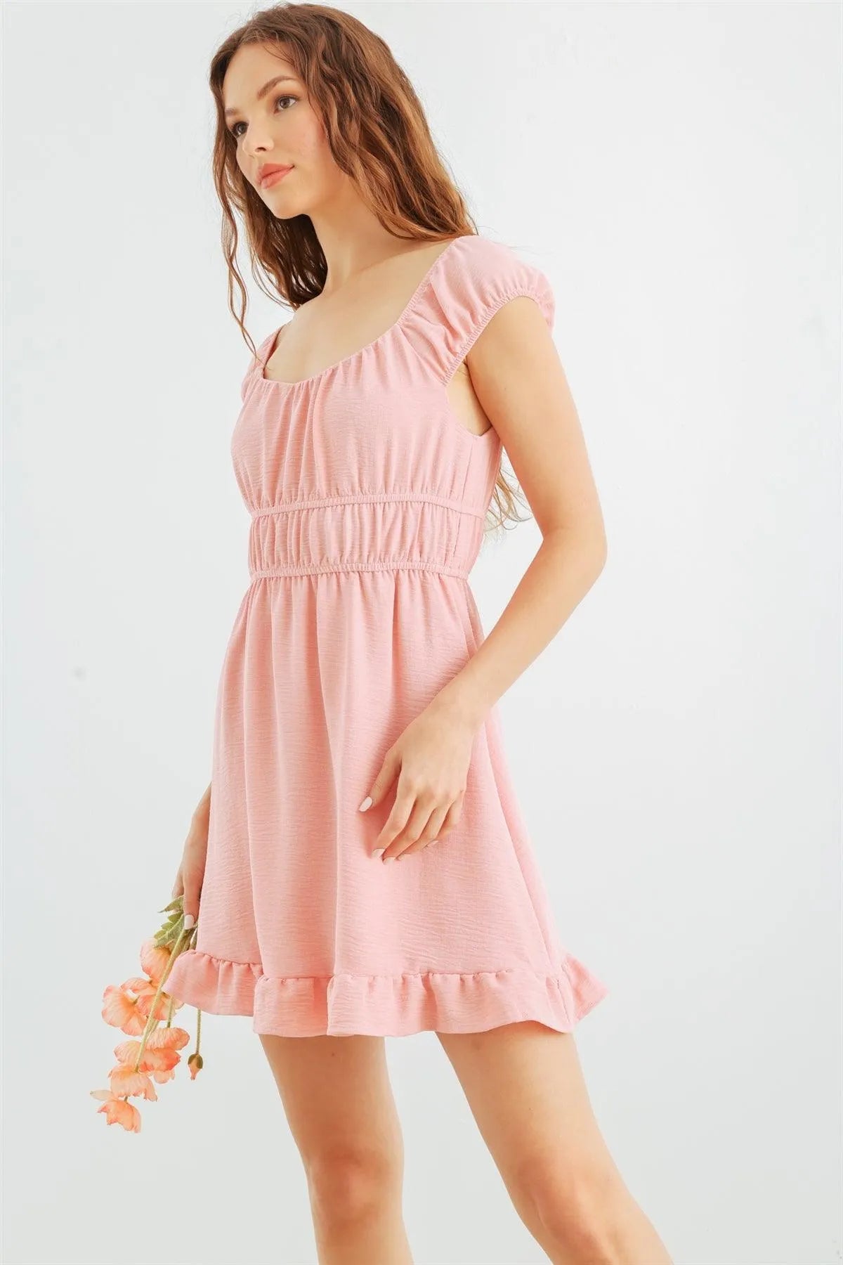 🖤 Item Features: Light pink, textured, sleeveless, square neckline, elasticized waistband, mini length, semi-stretchy, lined, cute, girlish, cool, must-have