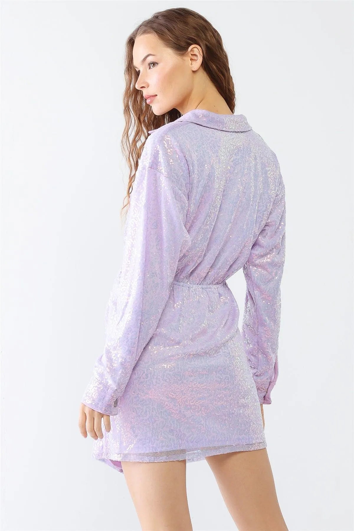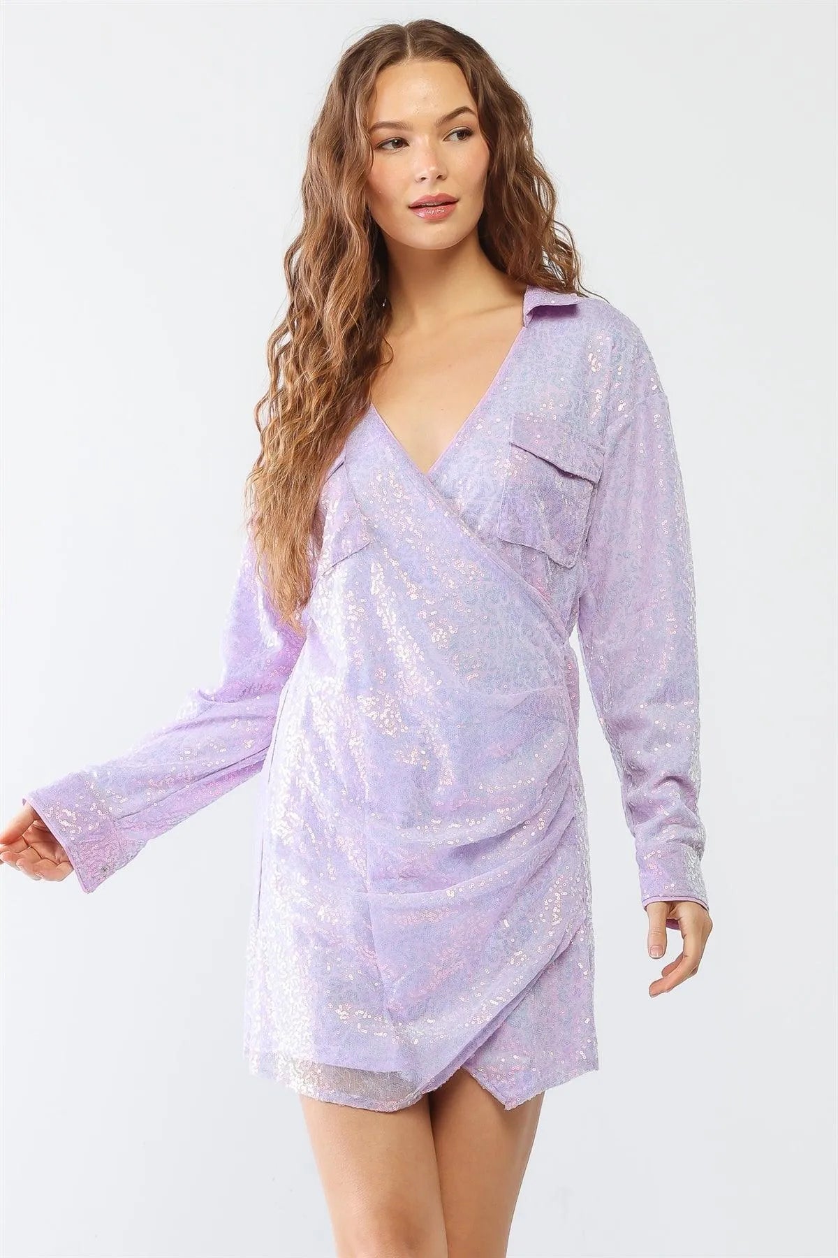Lilac Sequin Collared Wrap V-Neck Two Pocket Ruched Side Mini Dress /1-2-2-1