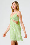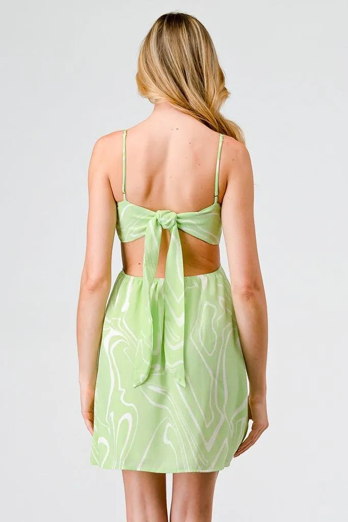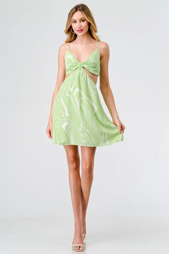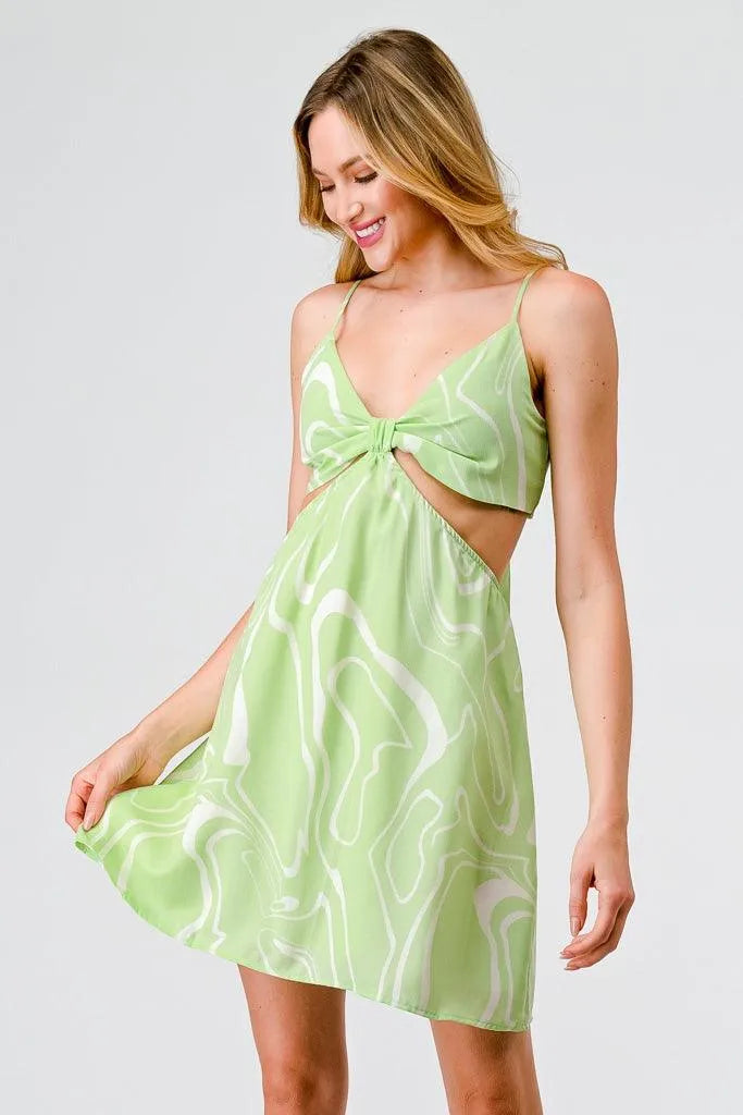 🖤 Item Features: Lime, white abstract print, front knot, cut-out sides, back tie, adjustable straps, sleeveless, v-neckline, mini length, semi-stretchy, lined, cute, girlish, cool, must-have, trendy, stylish
