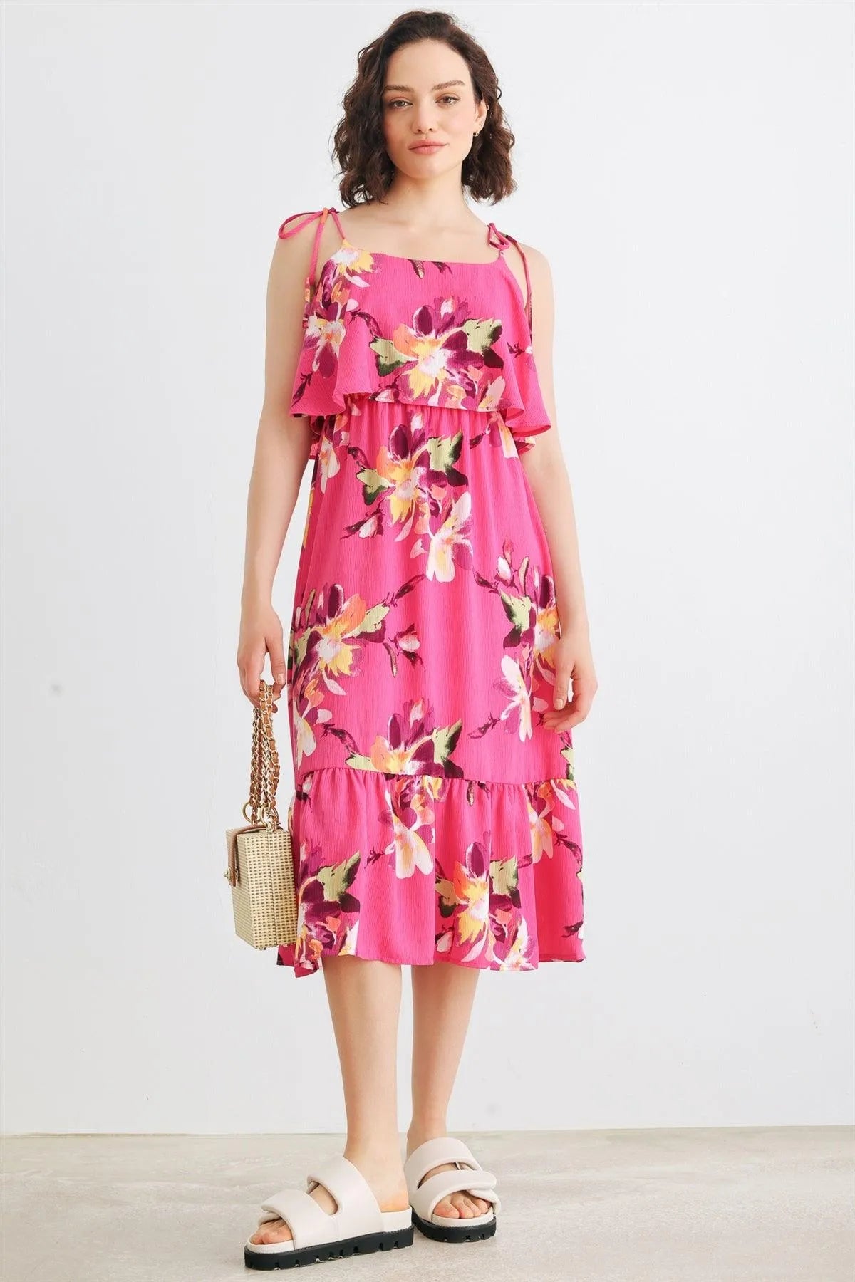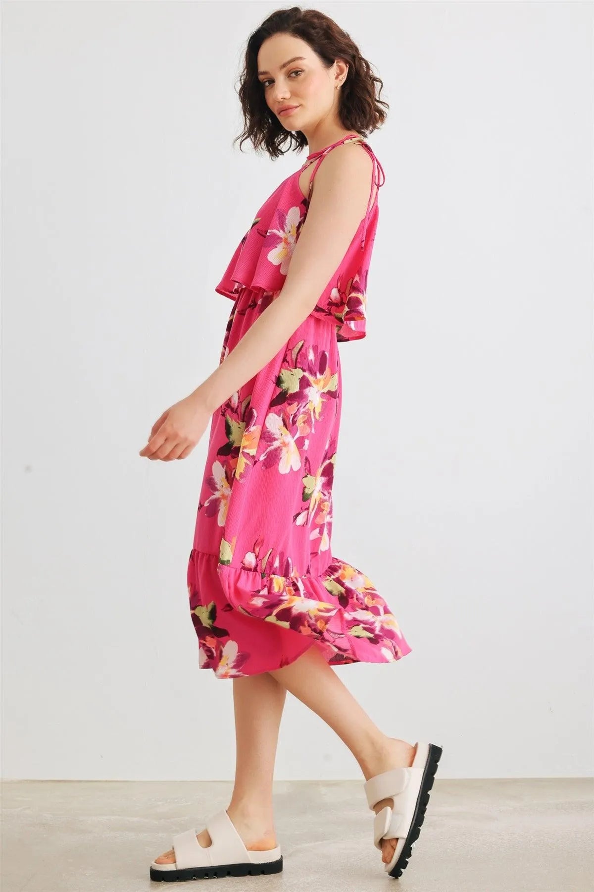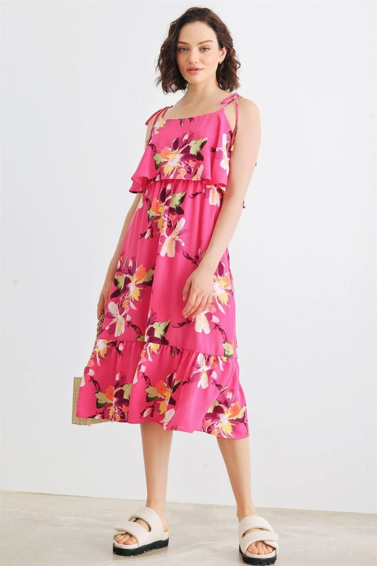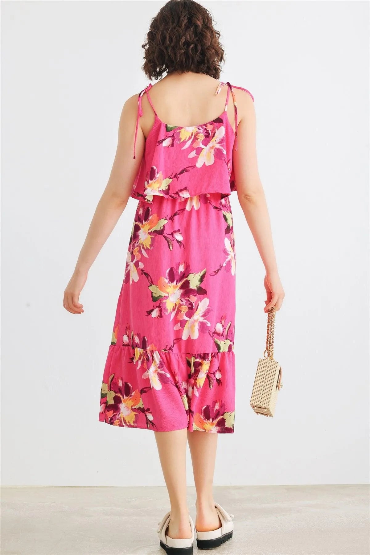 🖤 Item Features: Magenta, floral print, self-tie straps, sleeveless, flare detail, midi length, semi-stretchy, not see through, lined, cute, cool, girlish, trendy, stylish, must-have