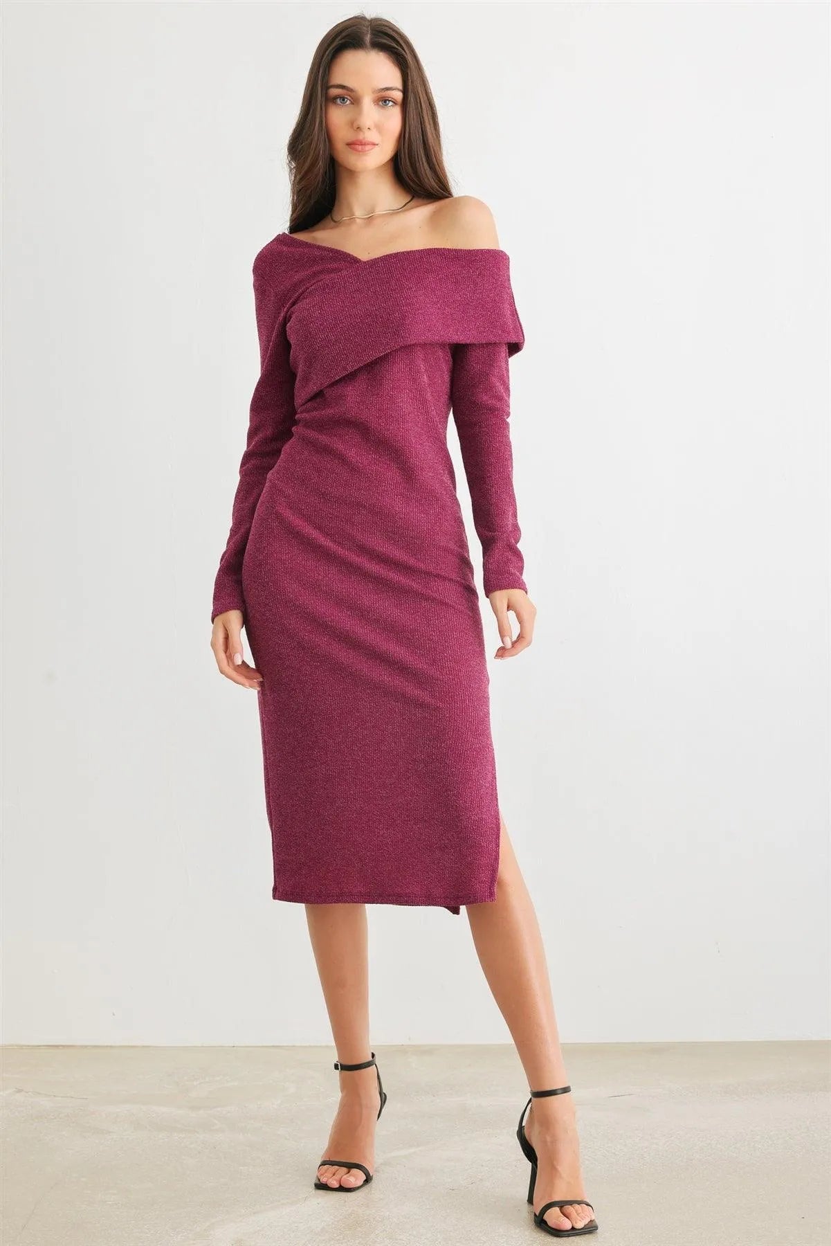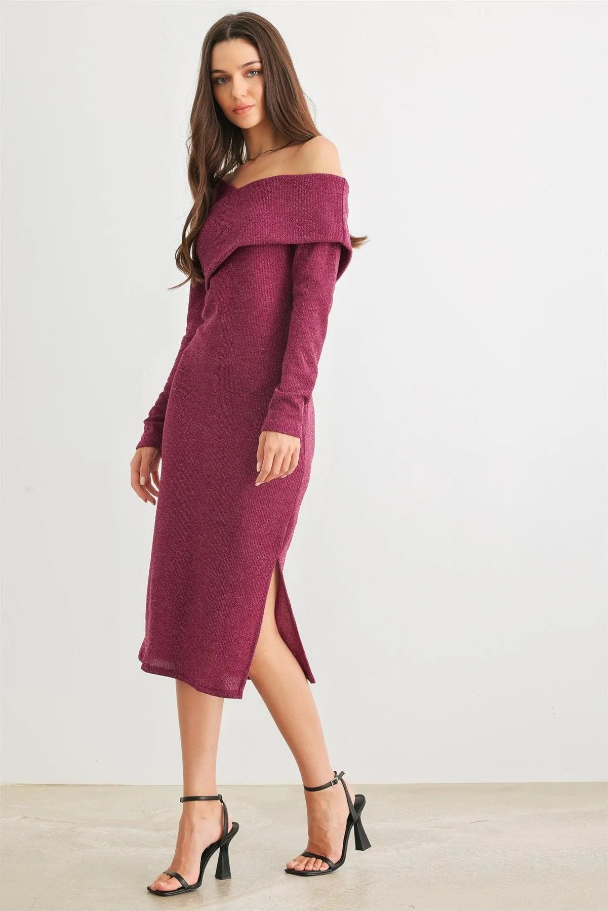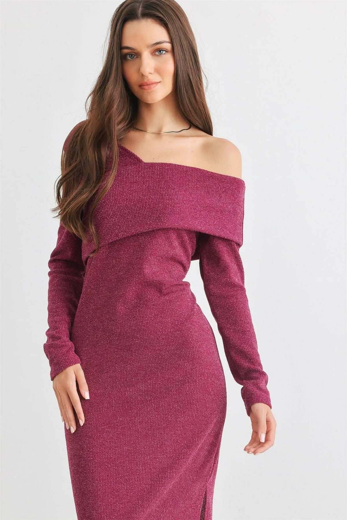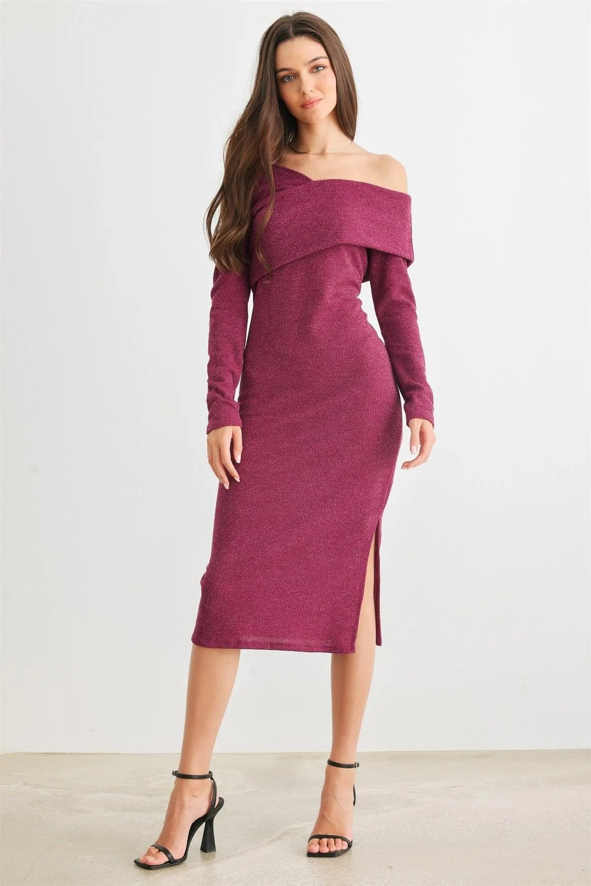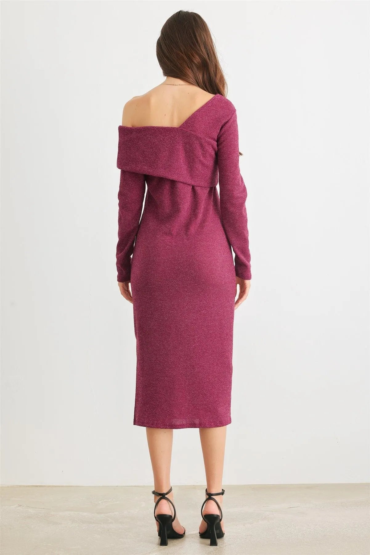 🖤 Stay cozy and cute in our Magenta Knit Cold Shoulder Collar Neck Midi Dress! Made with warm knit material, this dress features an asymmetrical one shoulder design and a collared neckline. It also includes long sleeves, a side slit, and a midi length for added style. Perfect for fall and winter, this dress is a must-have addition to your wardrobe.