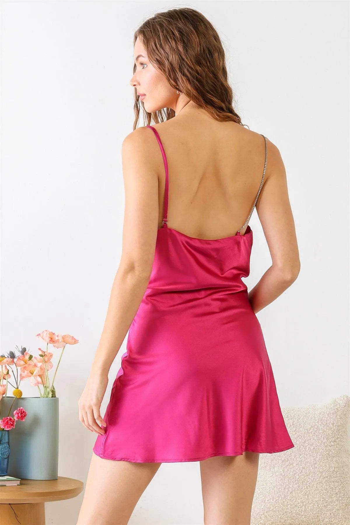 Magenta Satin Cowl Neck Rhinestone Strap Sleeveless Mini Dress /1-2-1