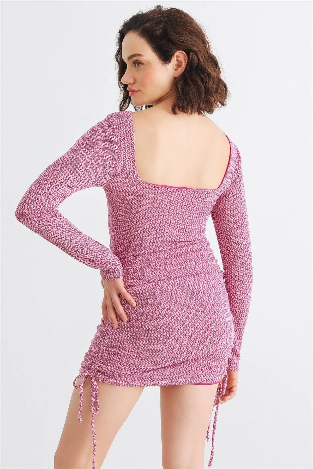 🖤 Item Features: Magenta & white, knit material, long sleeves, crew neckline, ruched sides with adjustable drawstring, mini length, semi-stretchy, not see through, lined, casual, cute, cool