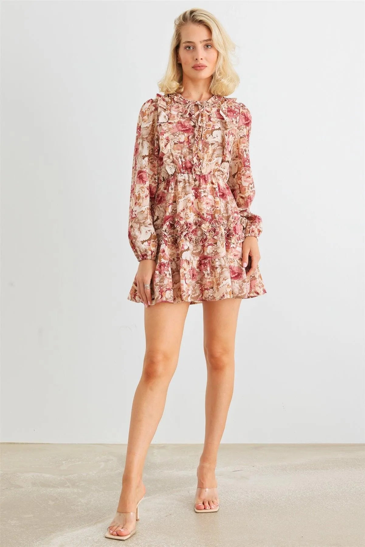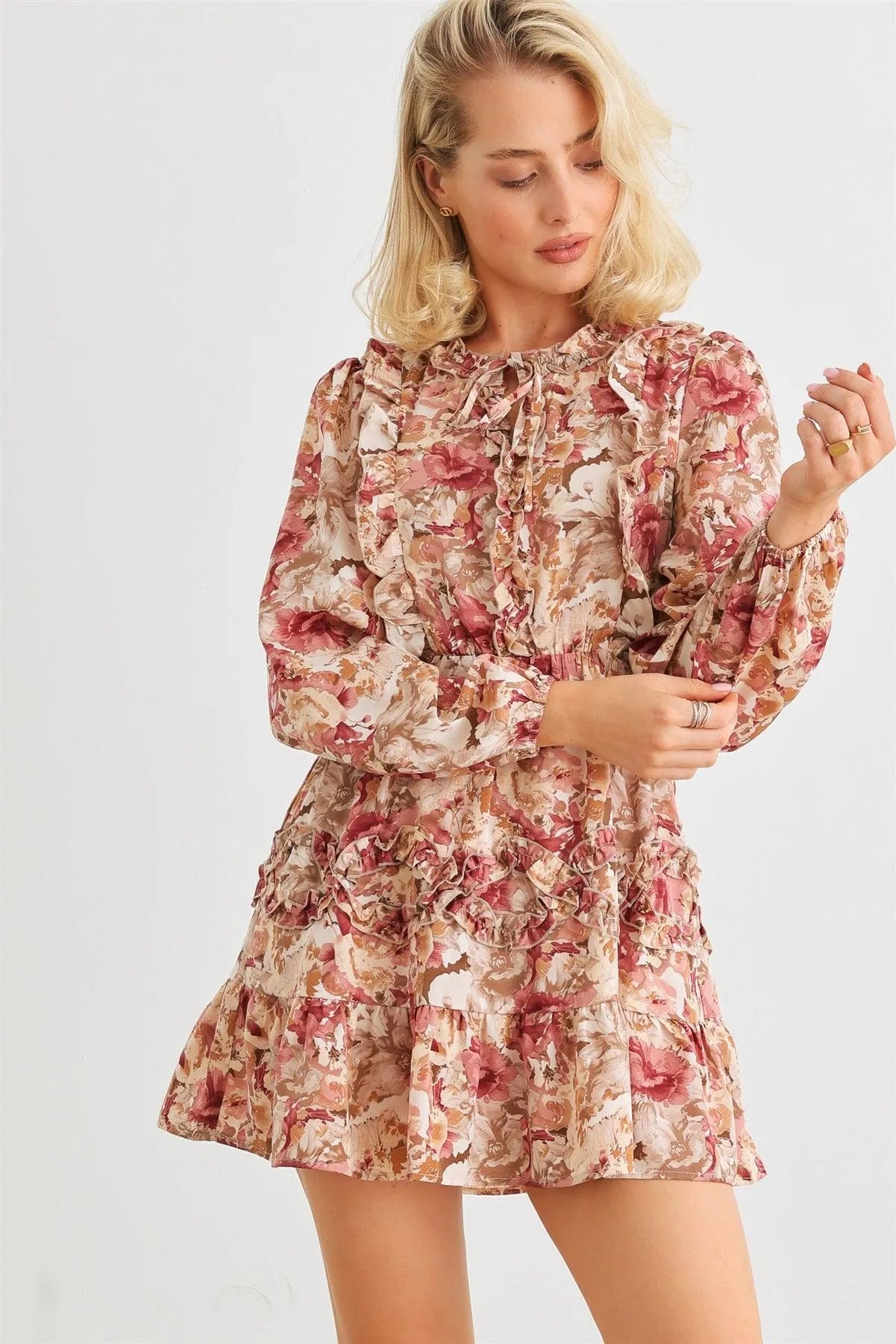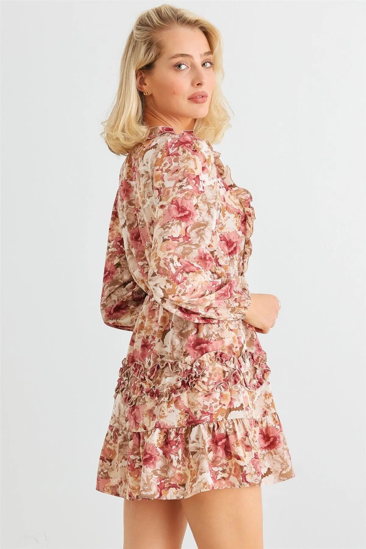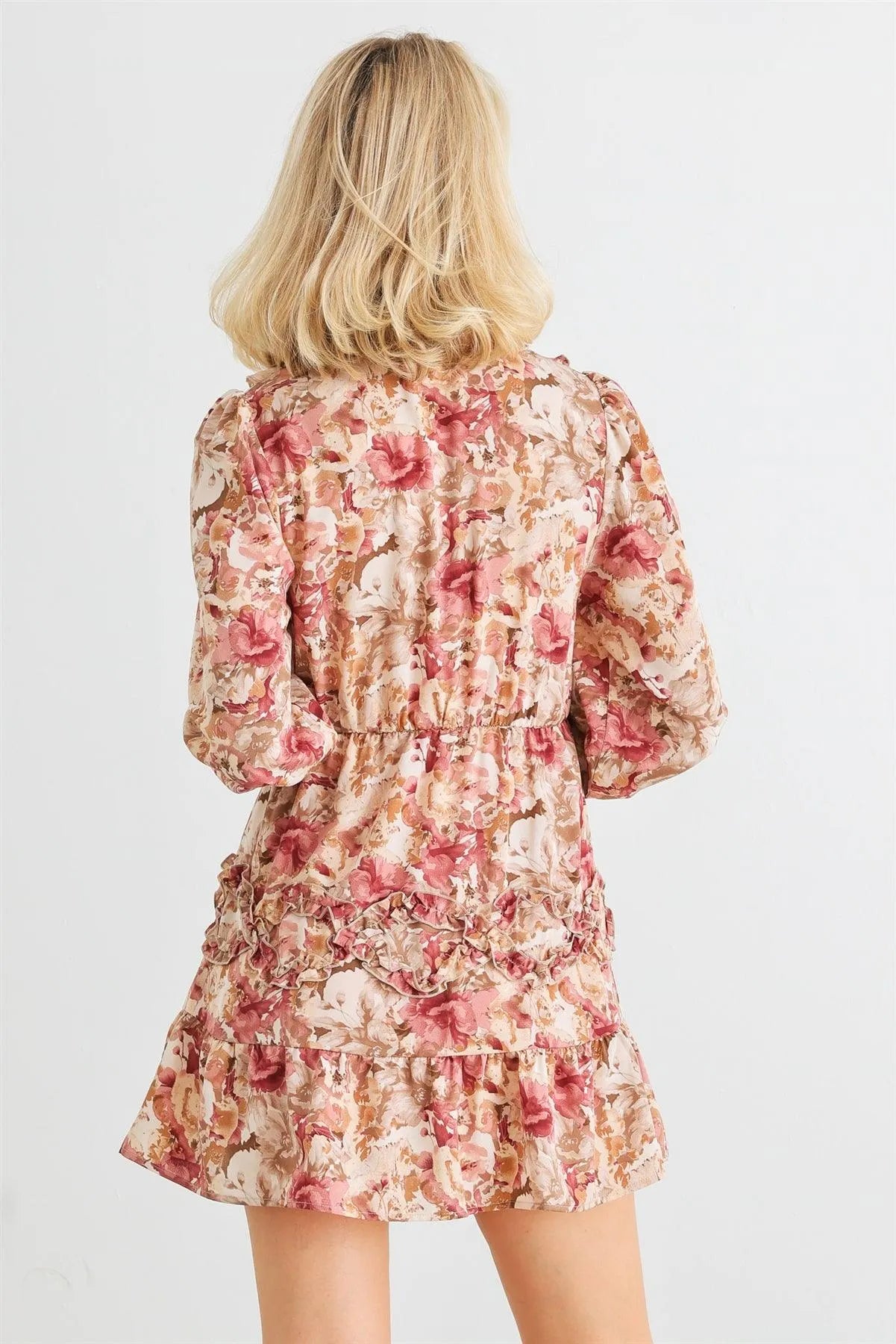 Mauve Floral Ruffle Tie Neck Puff Long Sleeve Mini Dress /2-2-2