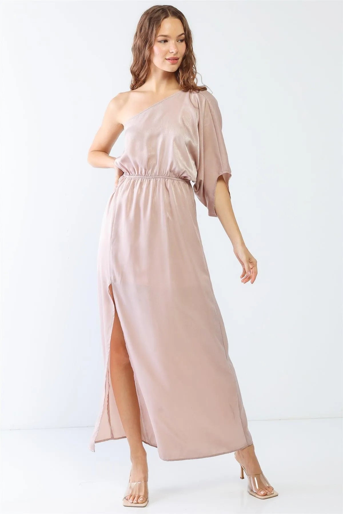 Achieve effortless elegance with our Shiny One Shoulder Batwing Sleeve Maxi Dress. Made with shiny fabric, this dress features a unique one shoulder design and flowy batwing sleeves, making it perfect for any special occasion. The sleek and sophisticated look will make sure you stand out in a crowd.