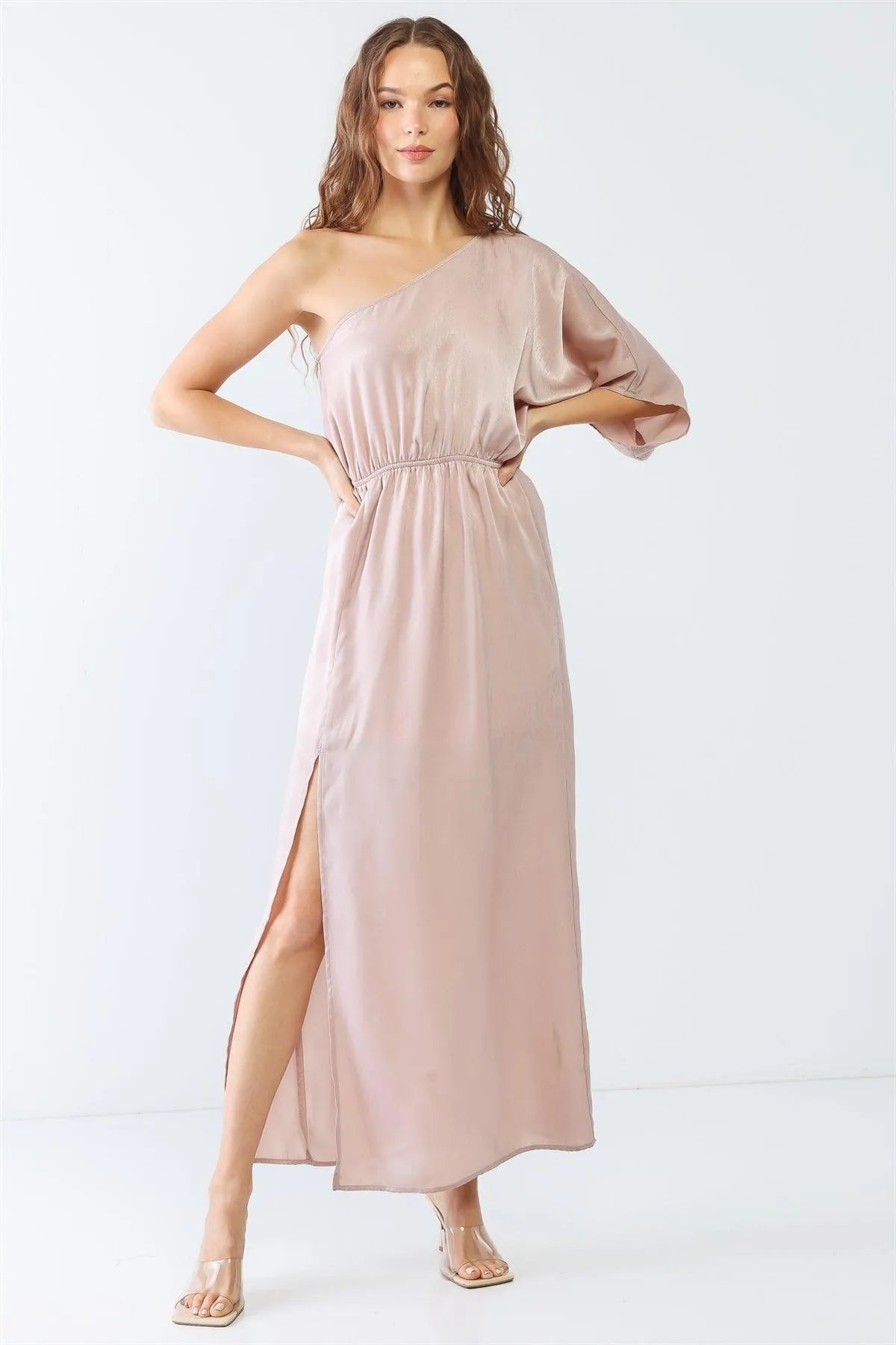 Women dress: Mauve, shining, elasticized waist, one shoulder, batwing sleeve, maxi length, semi-stretchy, lined, not see through, girlish, stylish, trendy, cute, elegant, eye-catching dress!