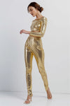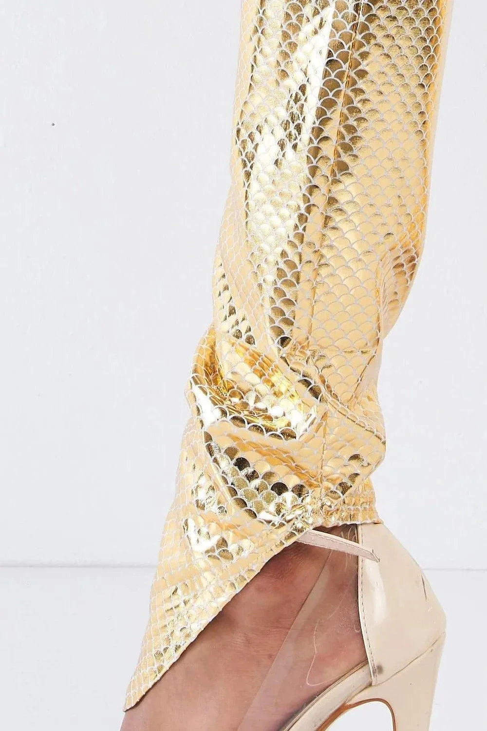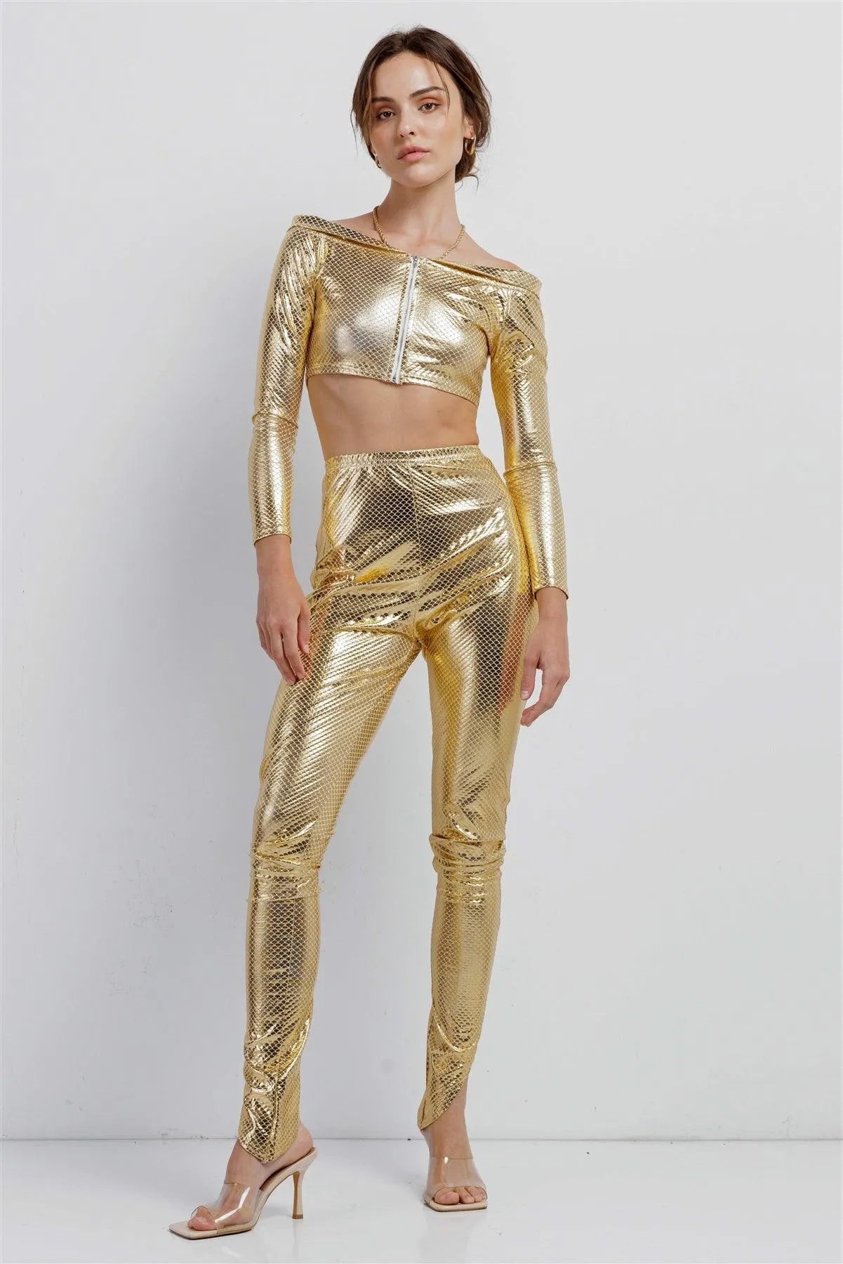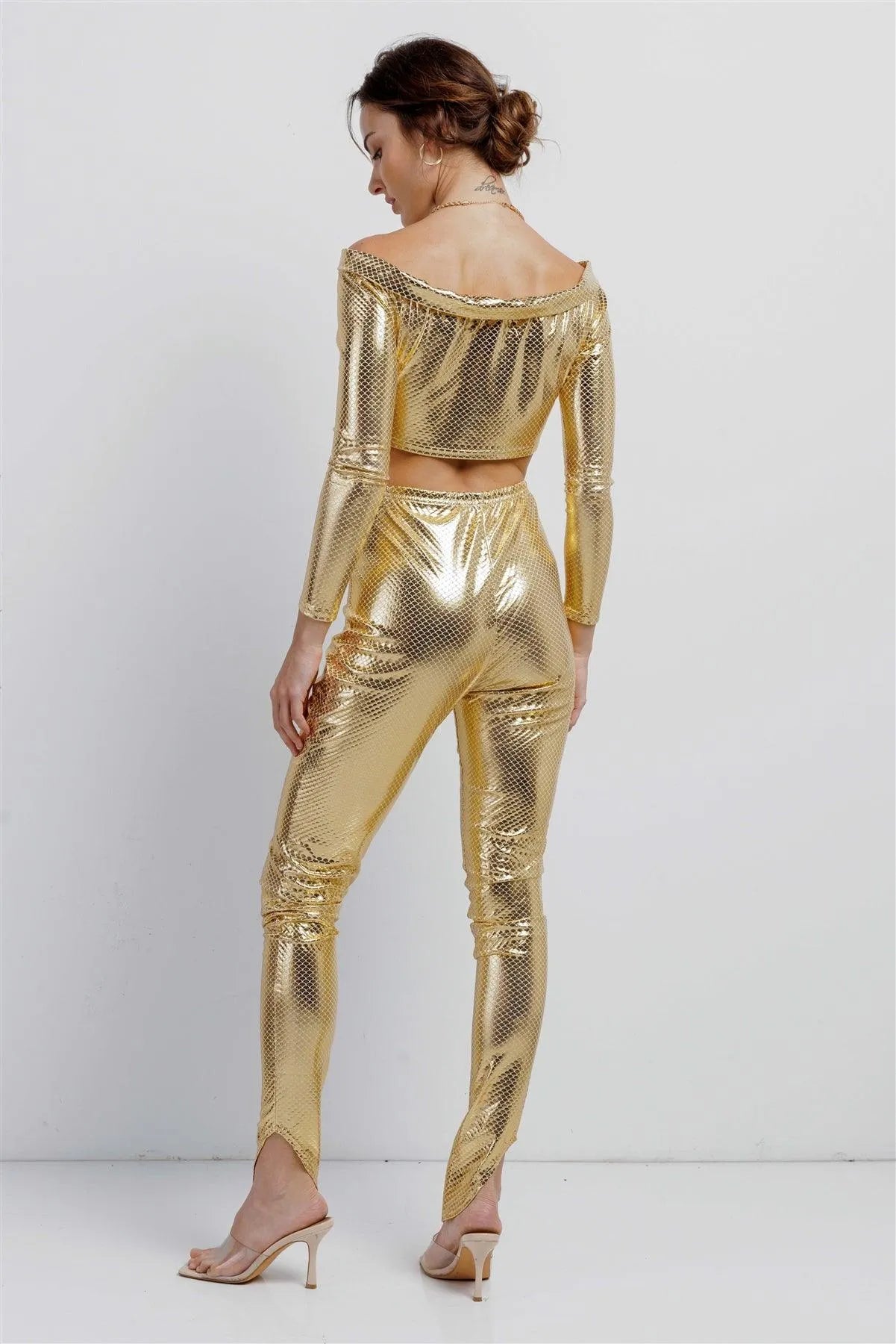 Metallic Gold Small Scales Print Long Sleeve Off-The-Shoulder Cropped Top And High Waist Slim Fit Legging Set /3-2-1