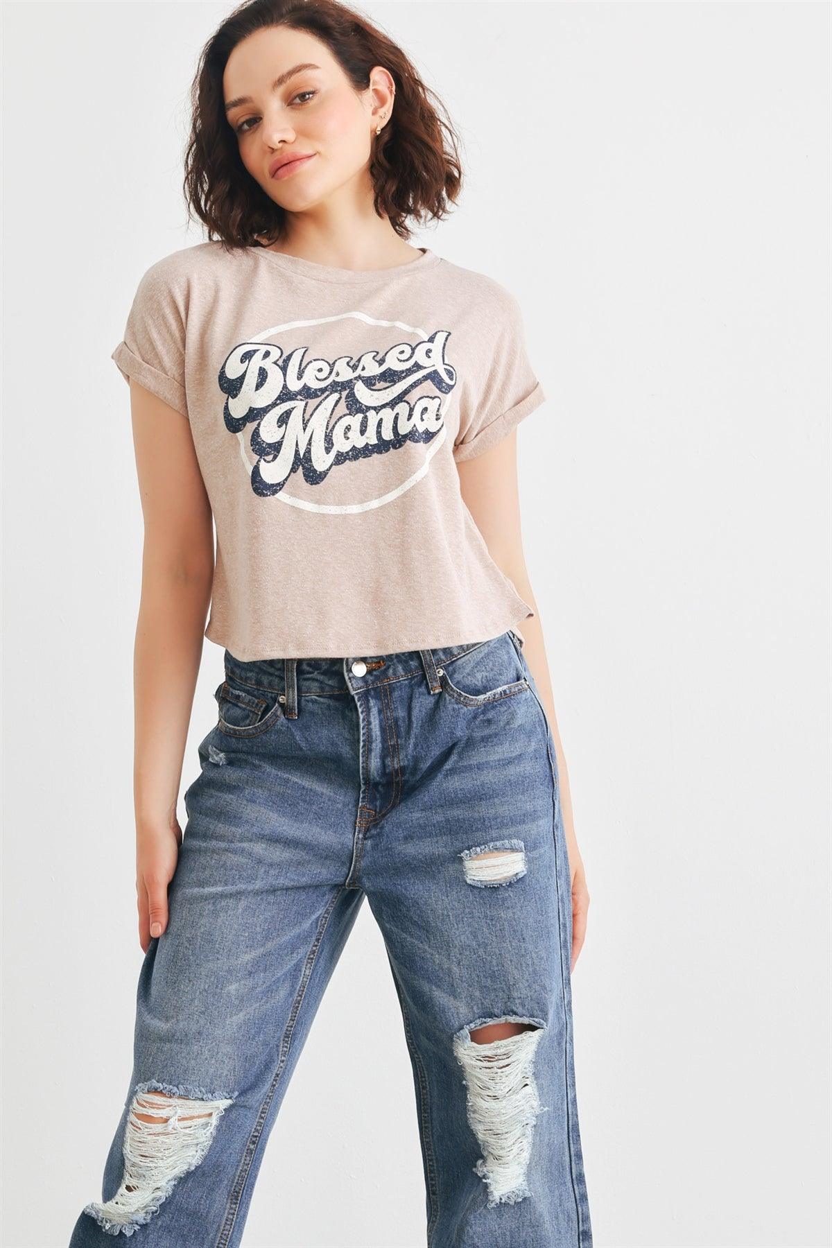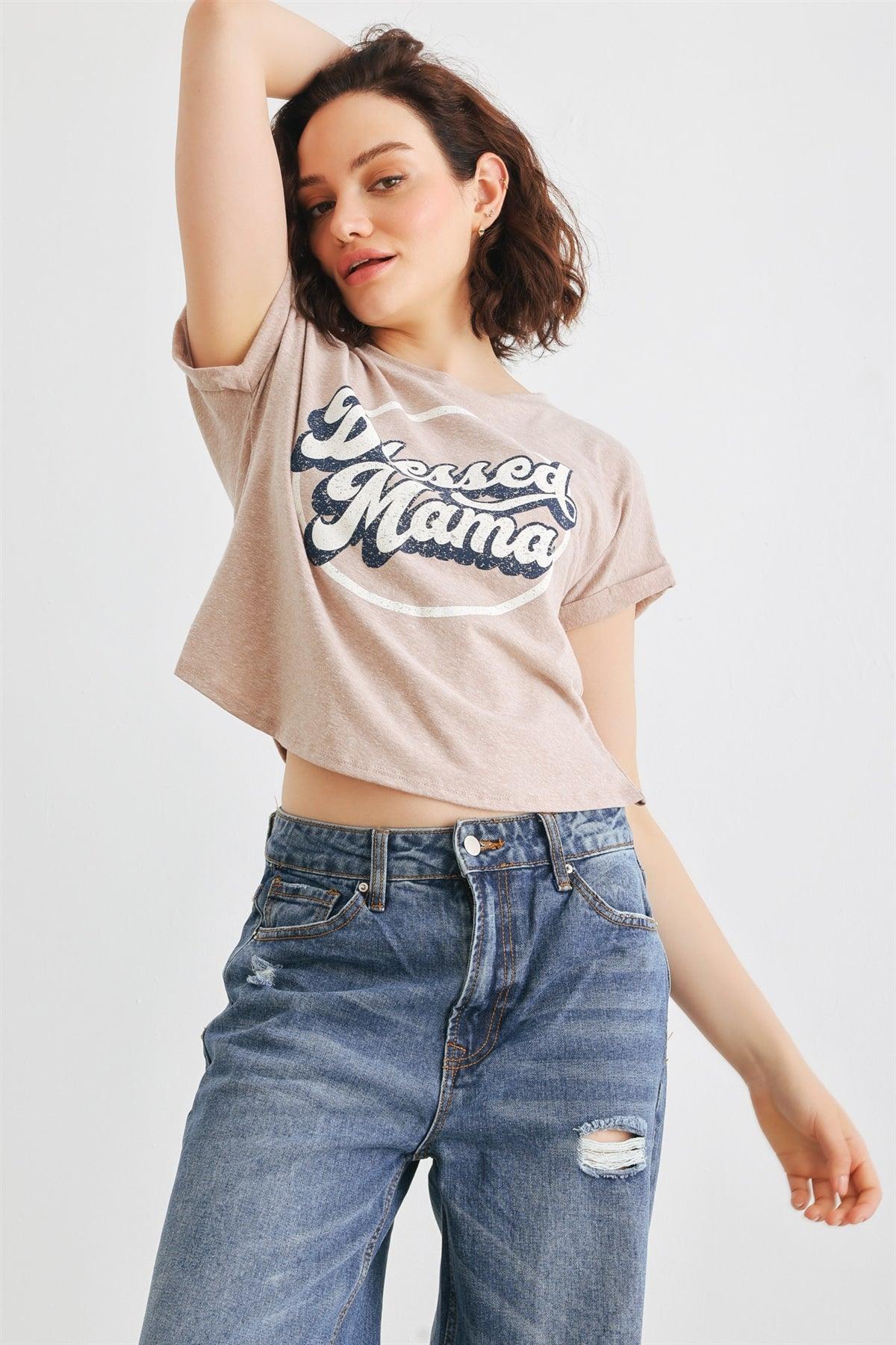 Mocha "Blessed Mama" Roll-Up Short Sleeve Crop Top /2-2-2