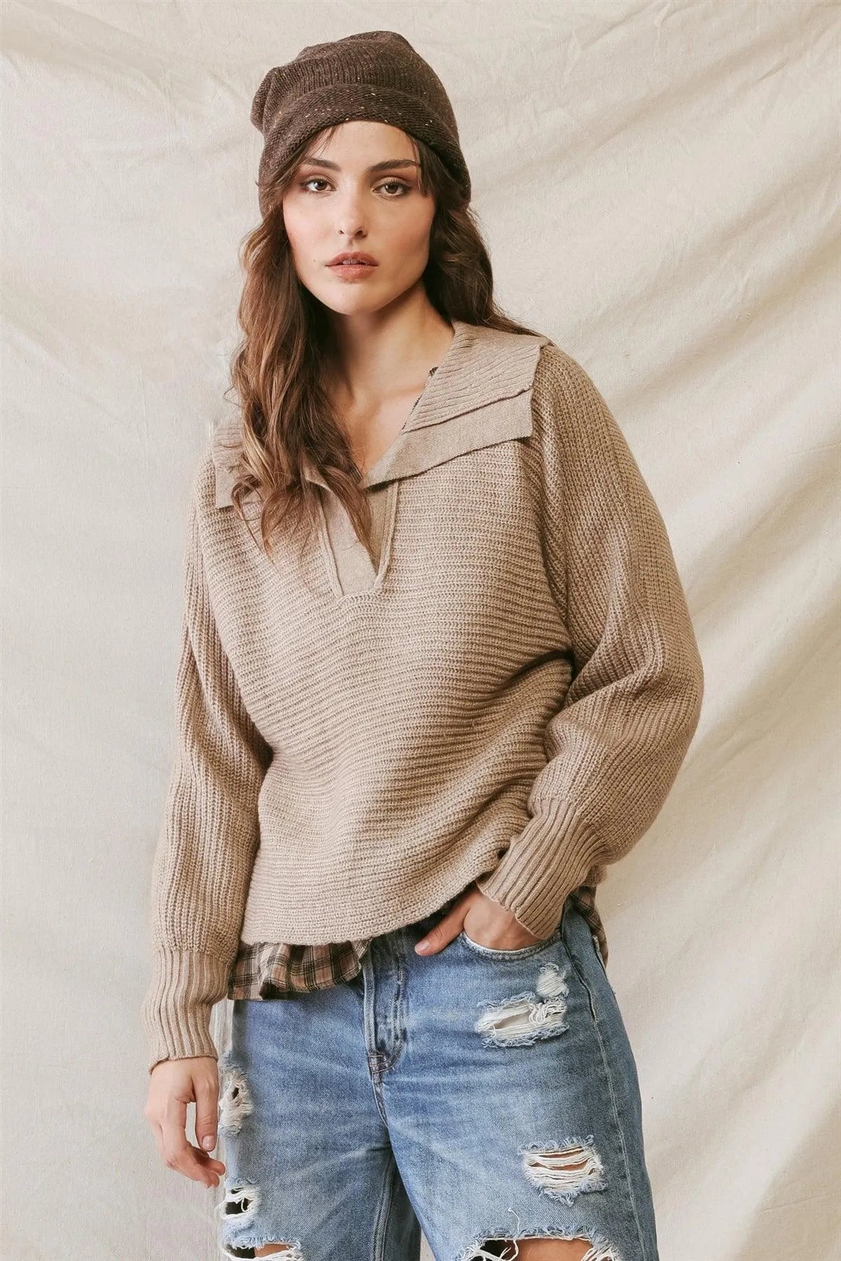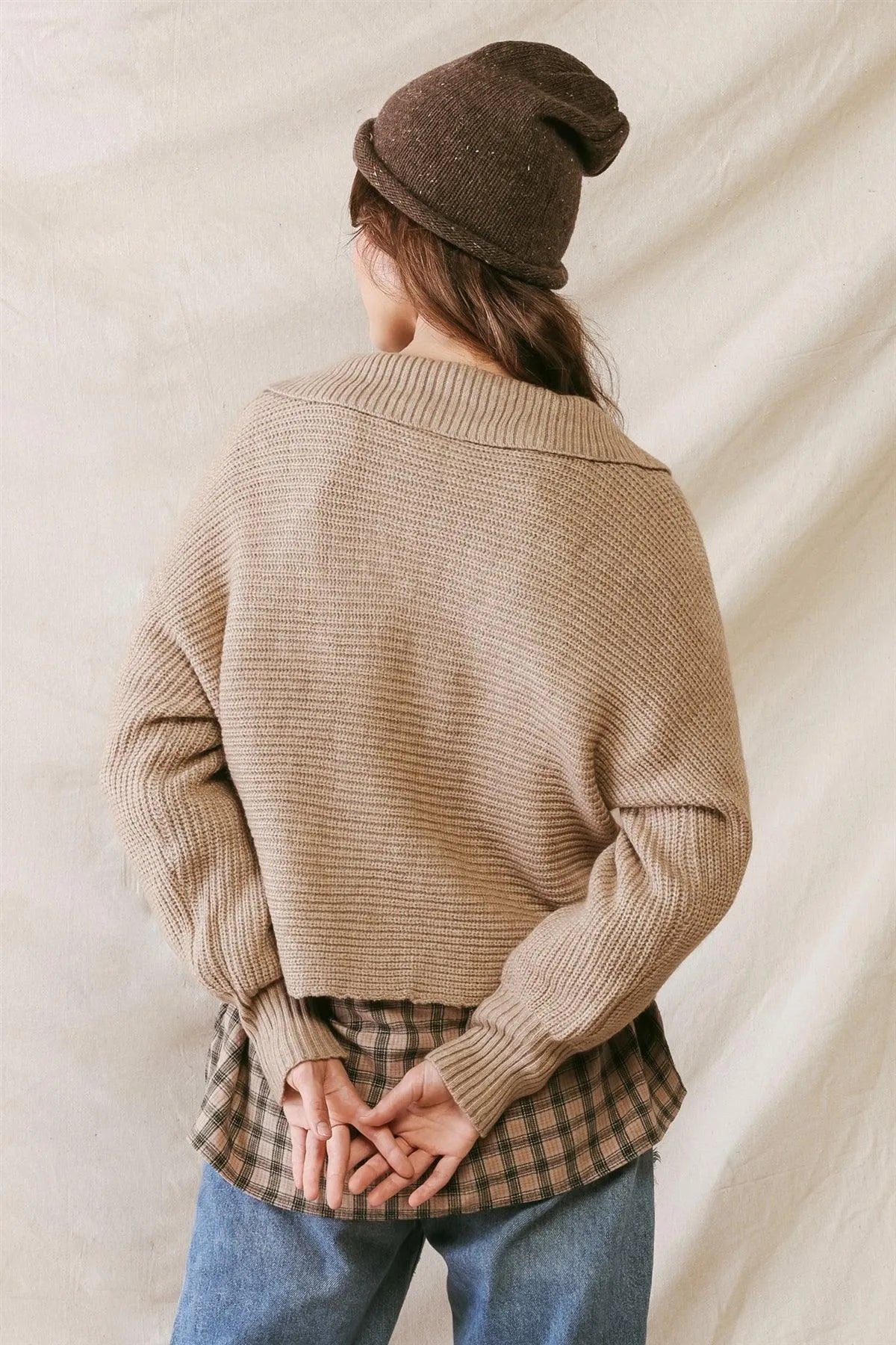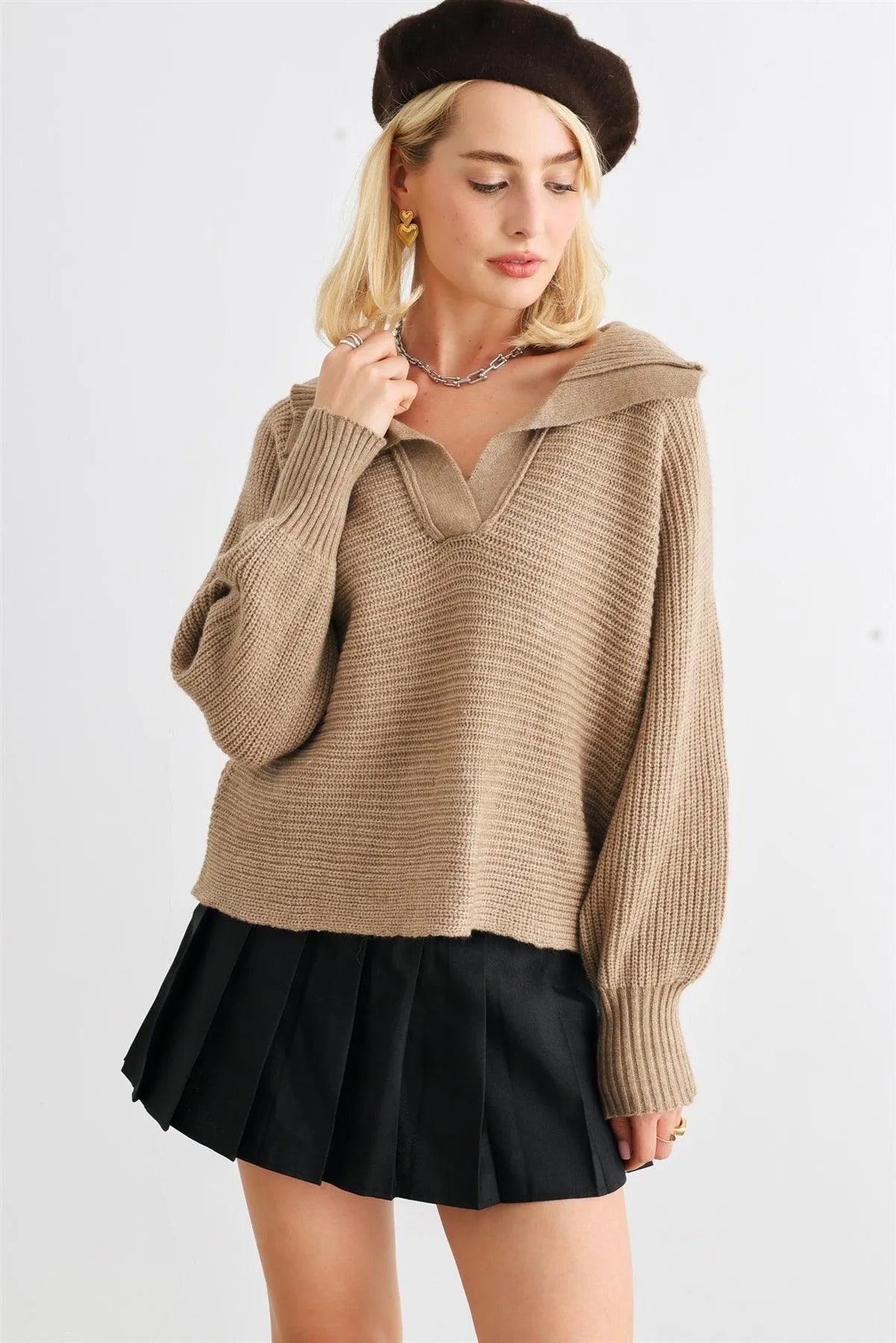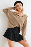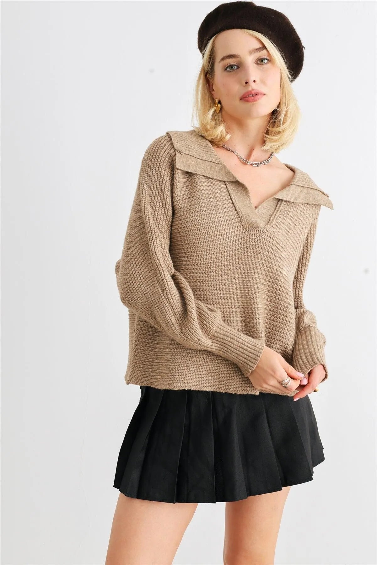 Mocha Knit Collared Long Sleeve Cropped Sweater /2-2-2