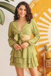Chiffon Long Sleeve Tie Front Crop Top & High Waist Tiered Mini Skirt Set