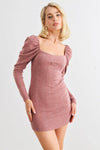 Rust Brown Ribbed Knit Balloon Sleeves Button-Front V-Neck Mini DressVendor:GILLI