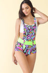 Multi Geo Print Elasticized One Pocket Sleeveless Belted Swim Romper