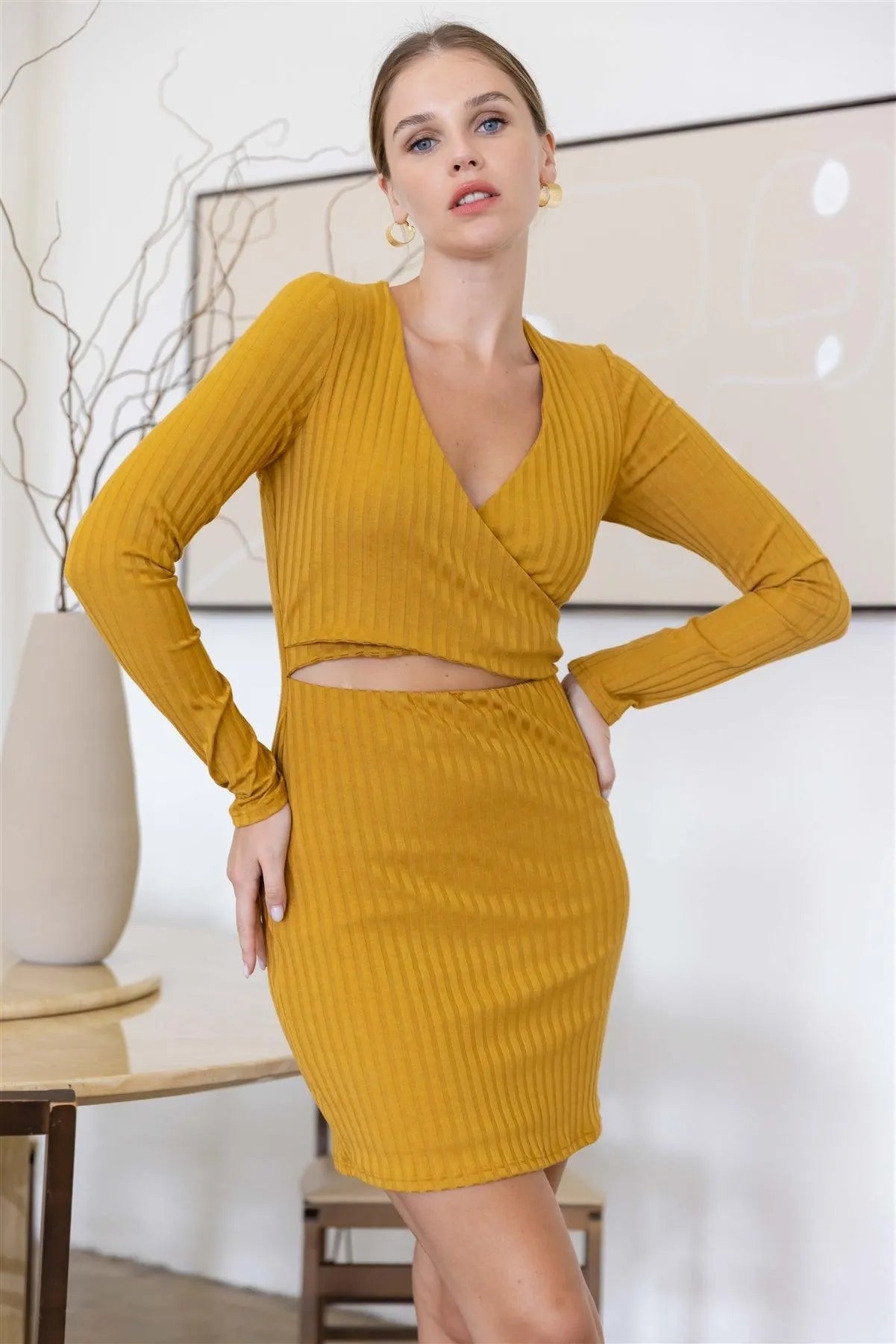 Mustard Ribbed Cut-Out Wrap V-Neck Long Sleeve Mini Dress /3-2-1