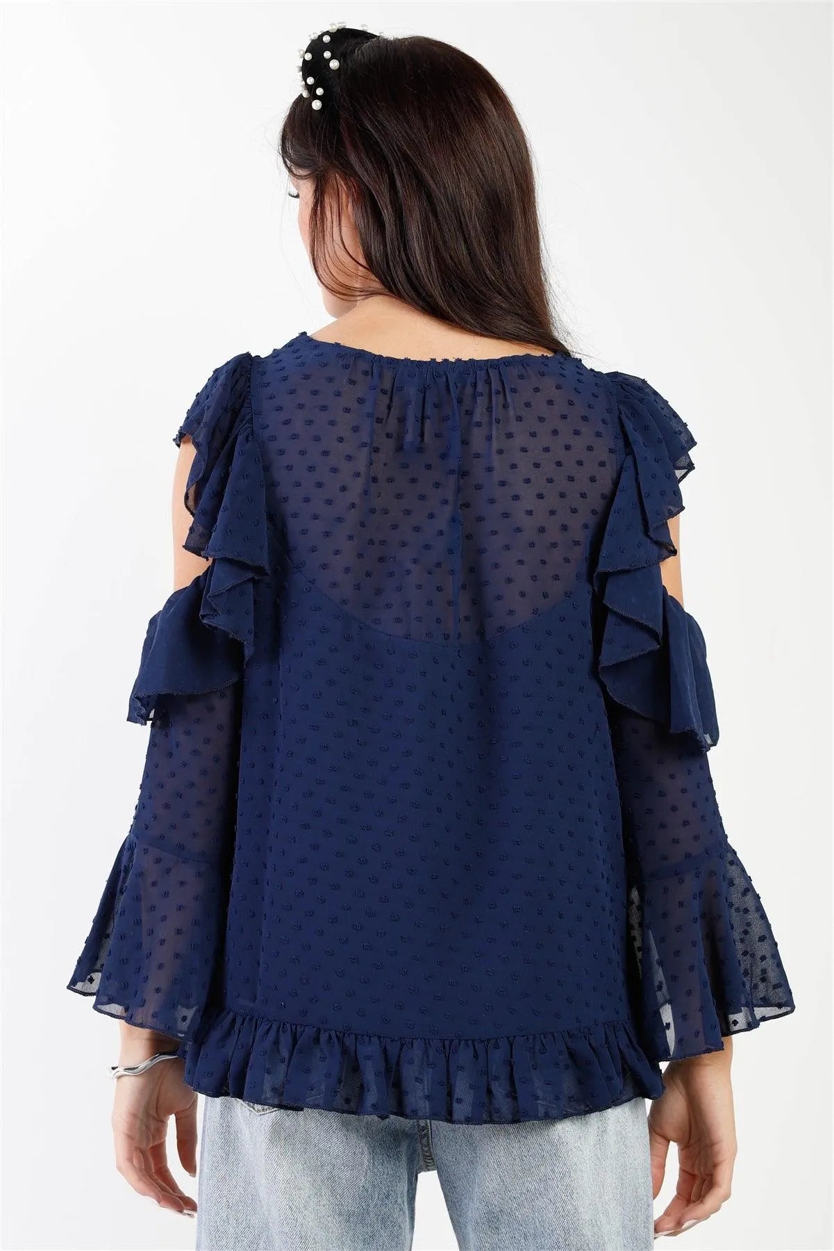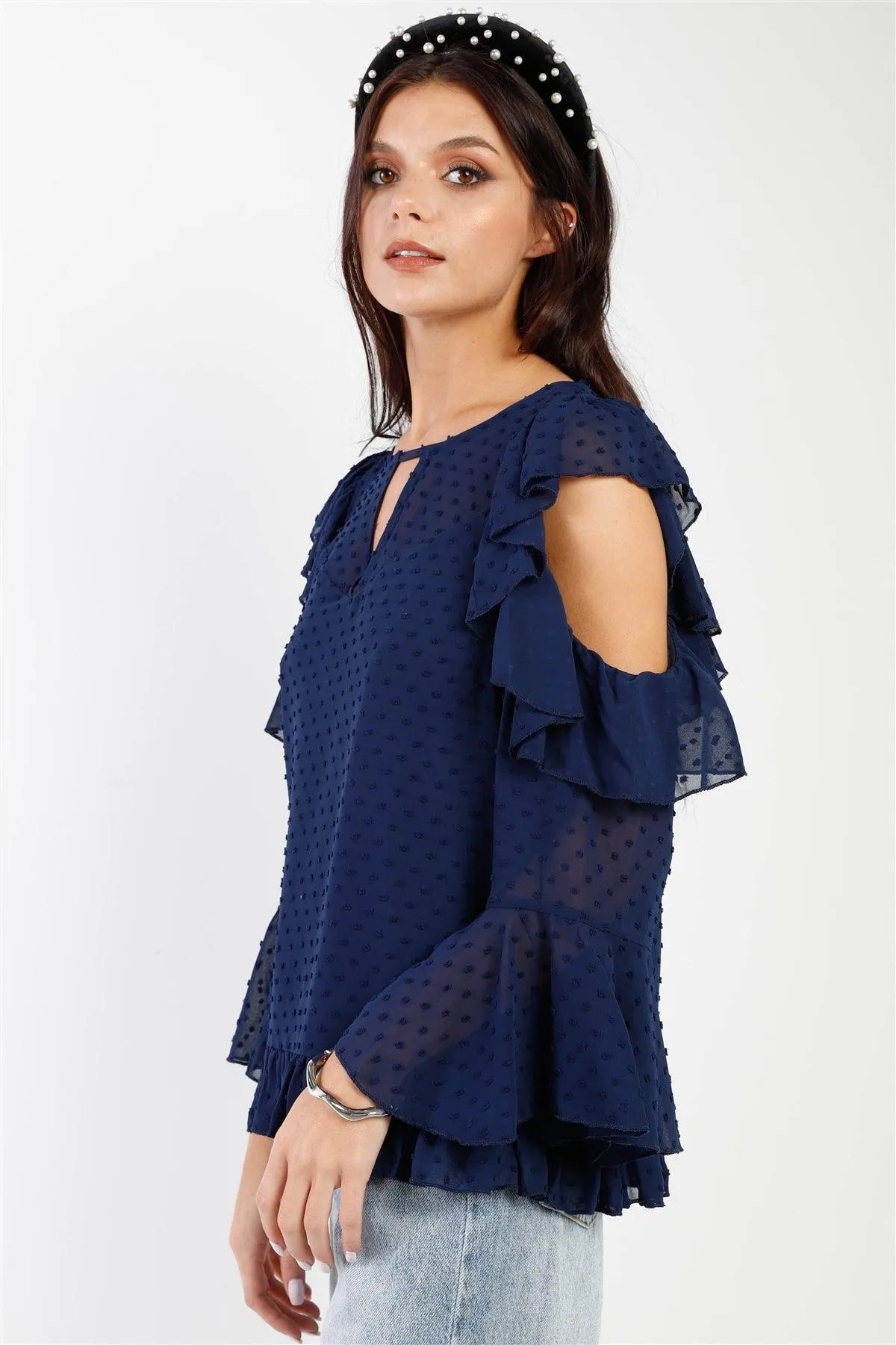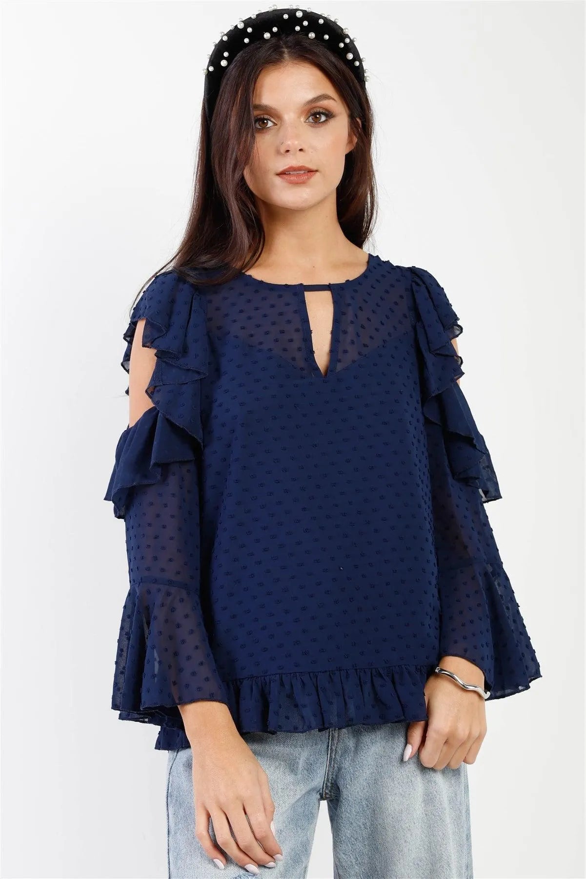 Navy Polka Dot Mesh Ruffle Cut-Out Details Top