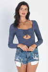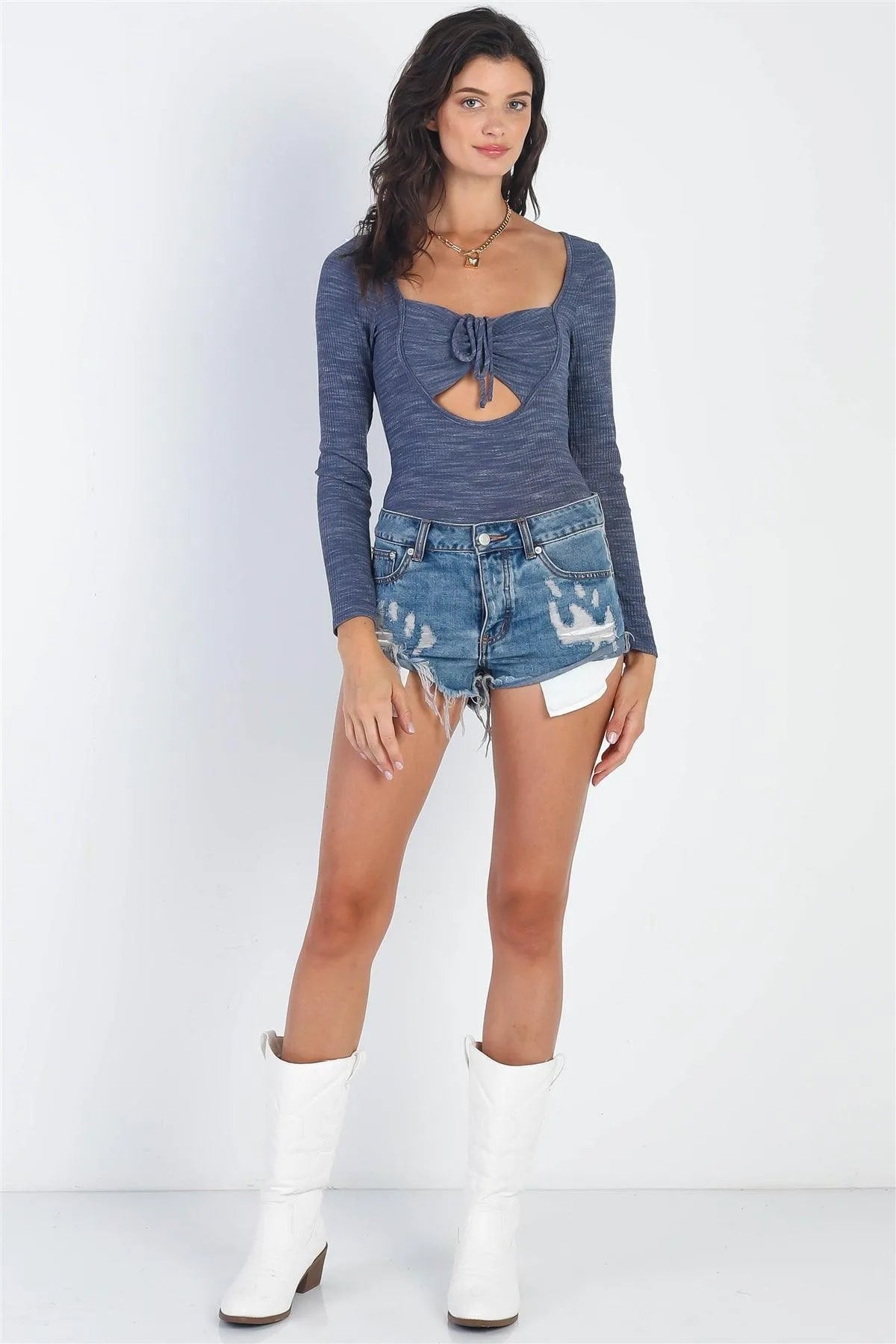 🖤 Item Features: Navy&white, ribbed, bustier ruched cut-out detail with adjustable drawstring, long sleeves, thong double snap closure, slim fit, stretchy, non-sheer, unlined, stylish, trendy, girlish, street style, cool, cute
