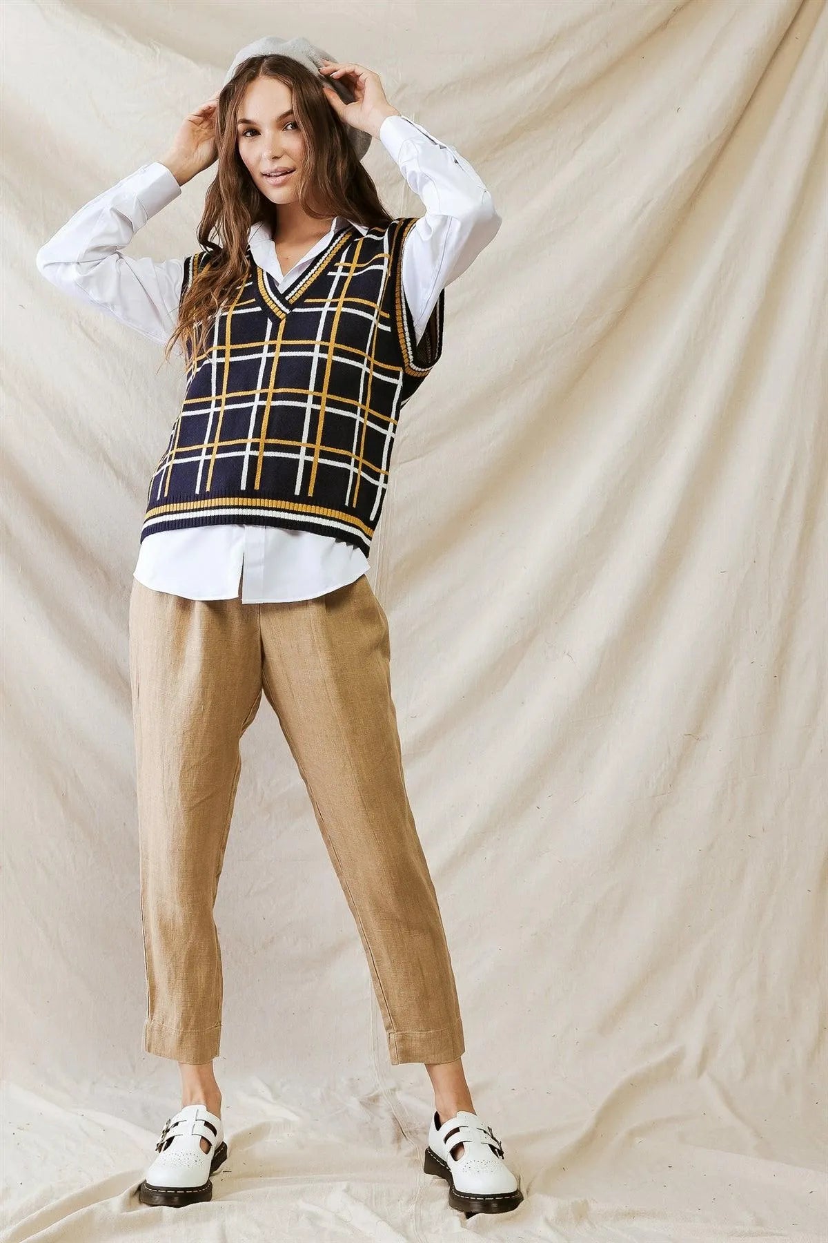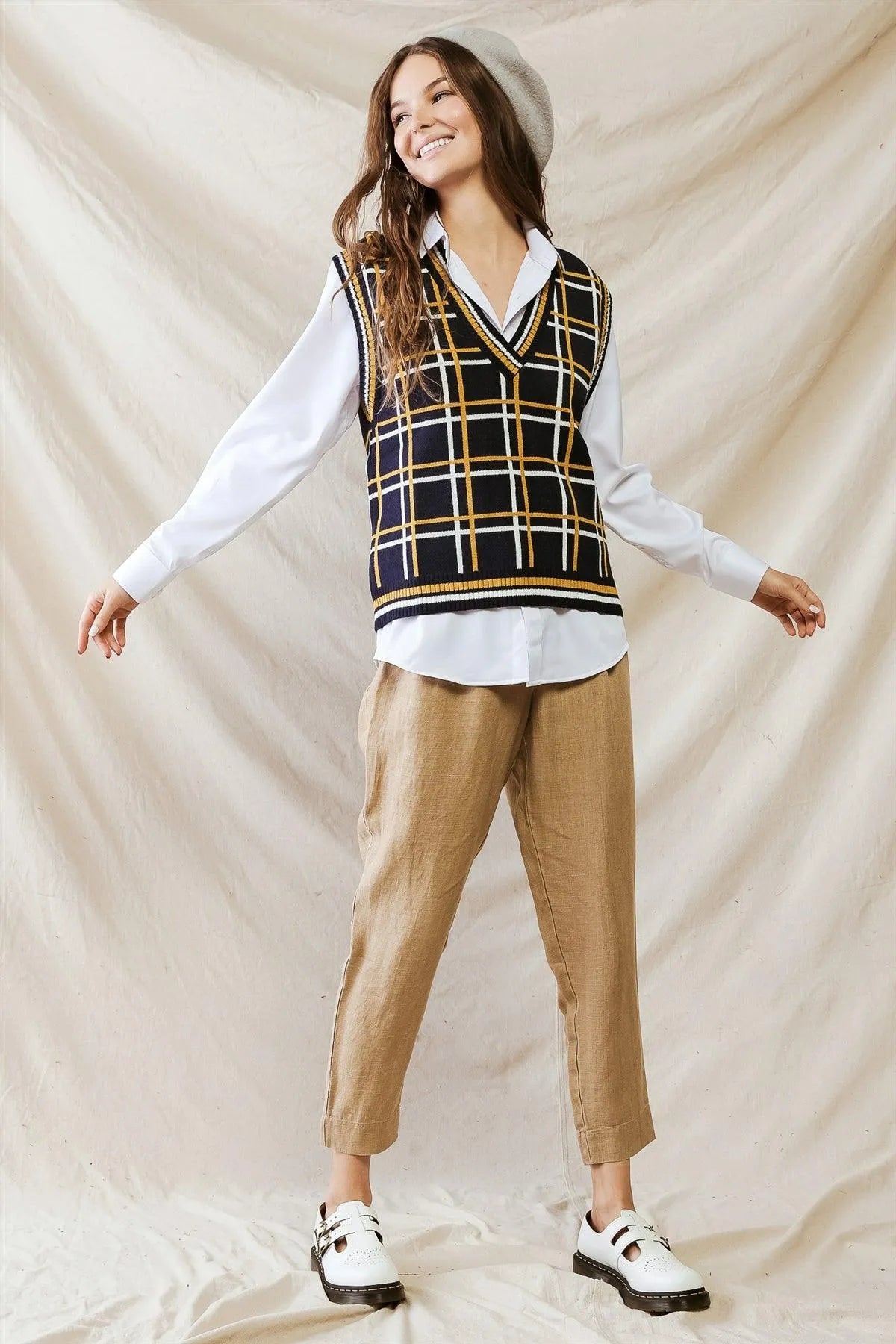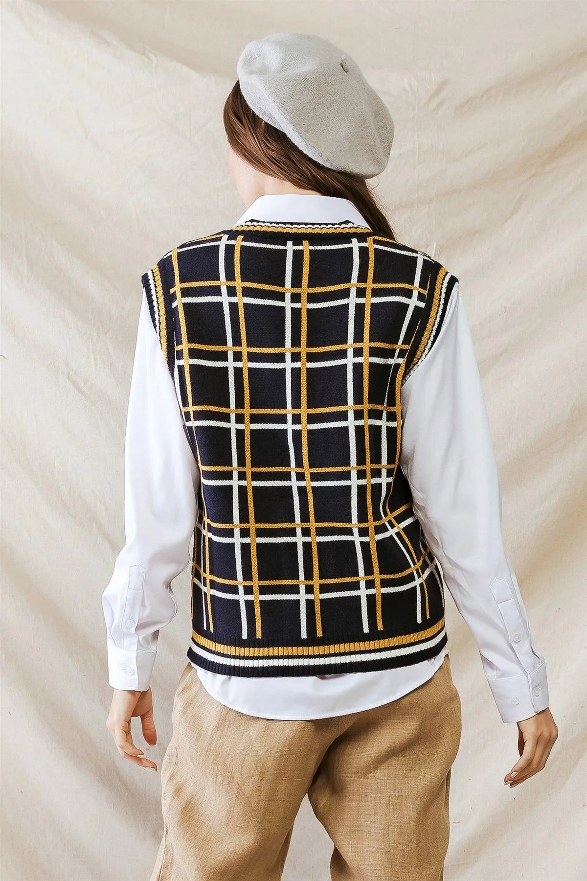 Navy White & Yellow Plaid Knit Sleeveless Vest /1-2-1