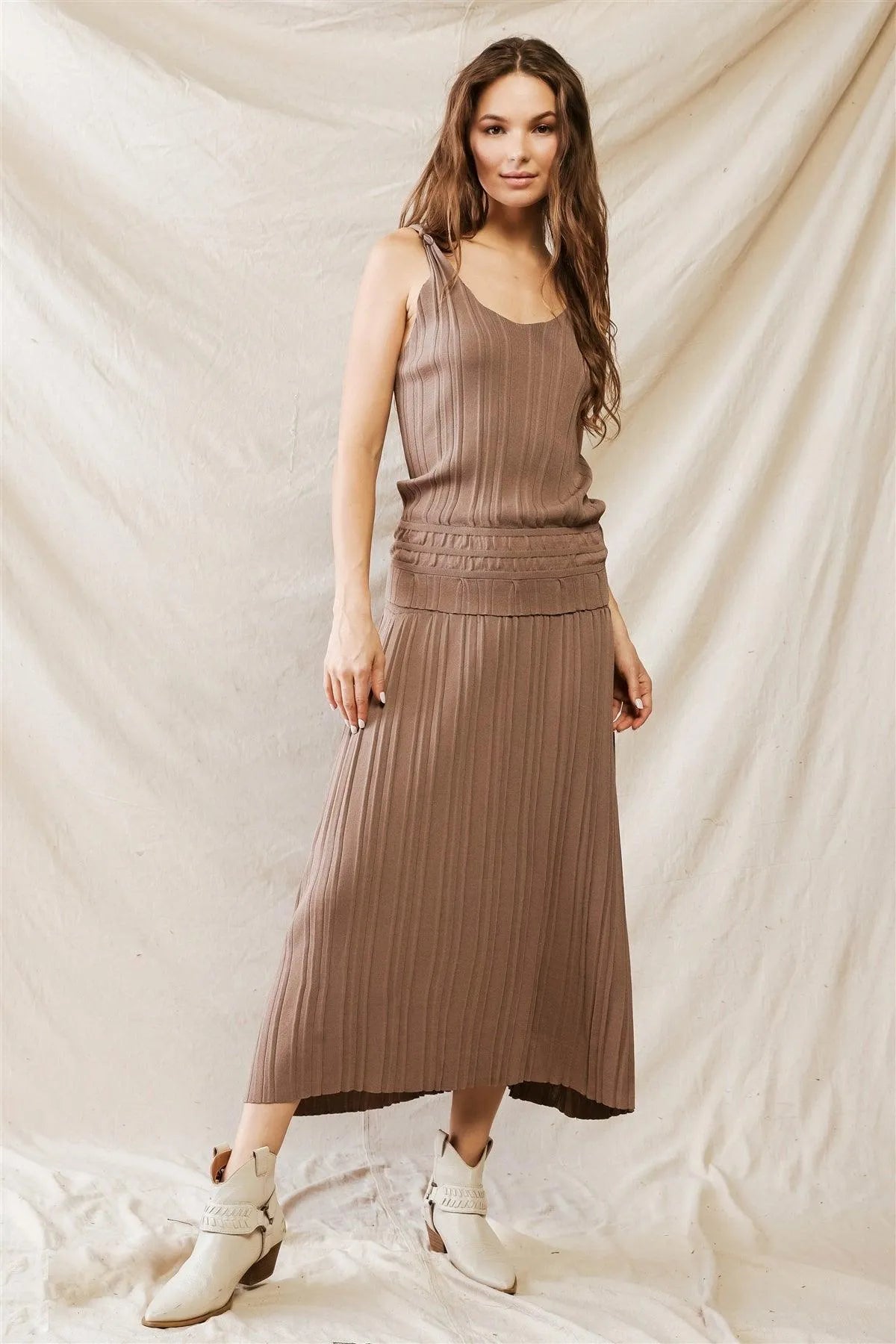 🖤 Item Features: Nude, solid color, viscose material, plaid, sleeveless, self-tie strappy, round neckline, stretchy, non-sheer, unlined top, high waist, midi plaid skirt, stylish, trendy, must-have, lifestyle, comfy