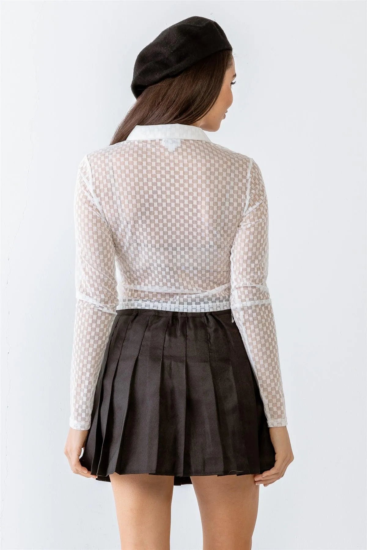 Off-White Plaid Lace Sheer Mesh Collared Button-Up Crop Top /3-2-1