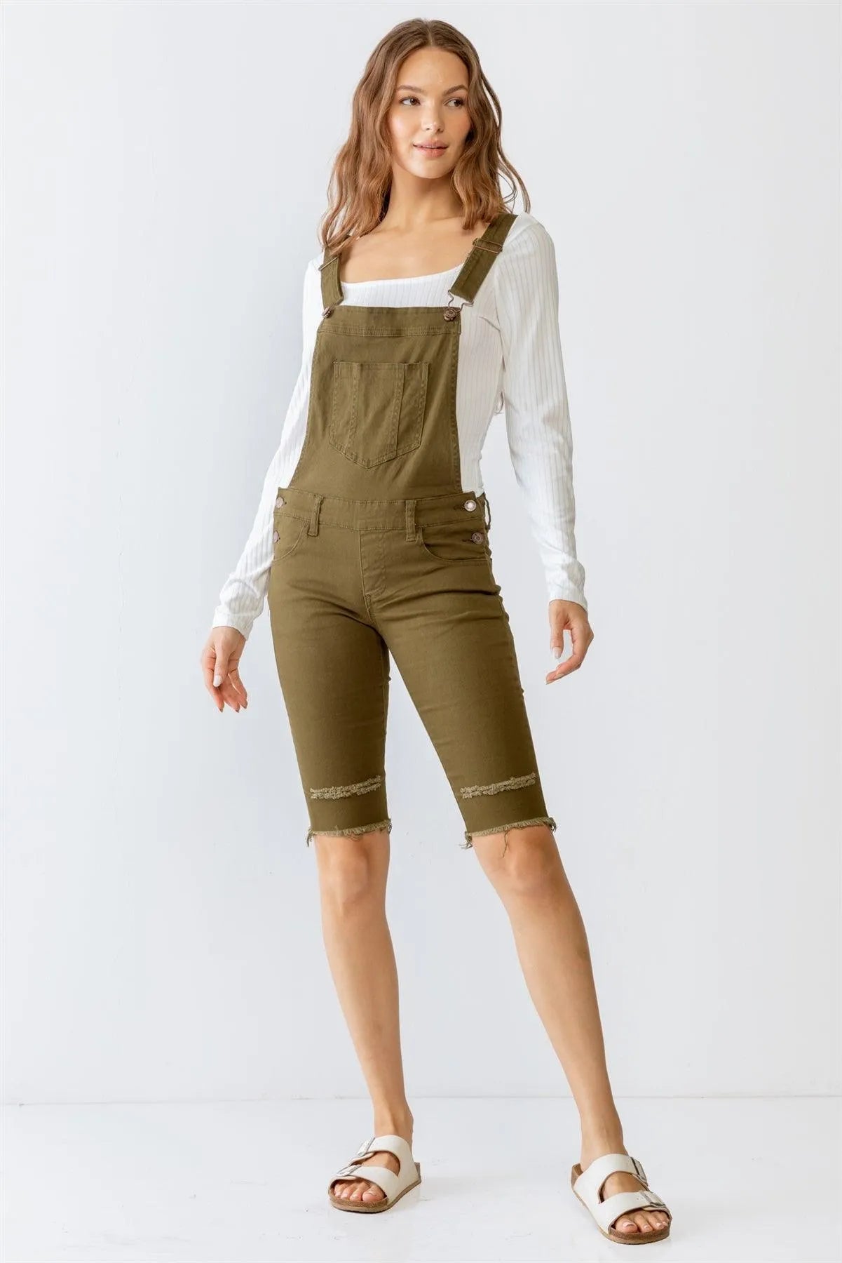 Olive Denim Distressed Detail Raw Hem Cropped Bermuda Overall /4-2-1
