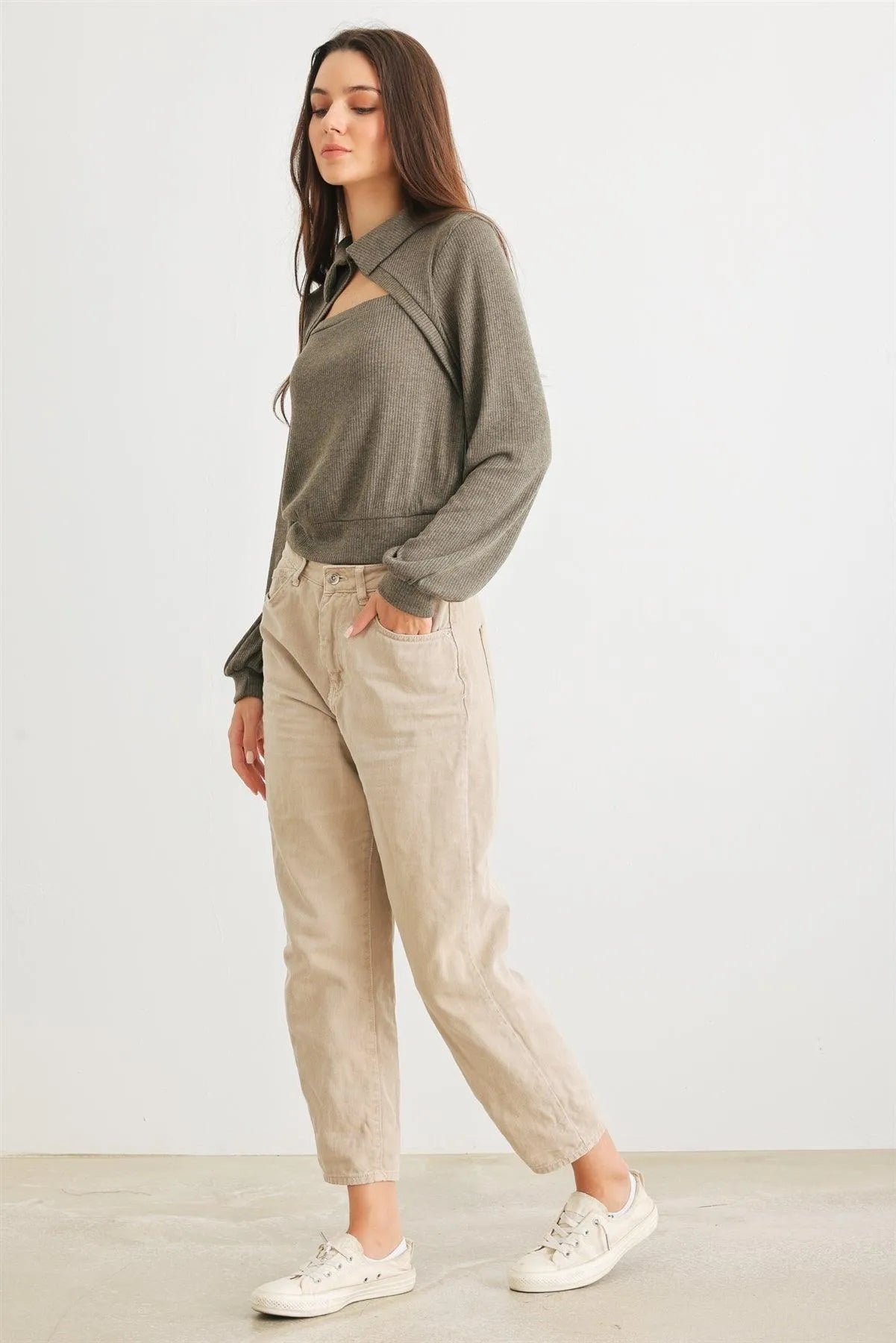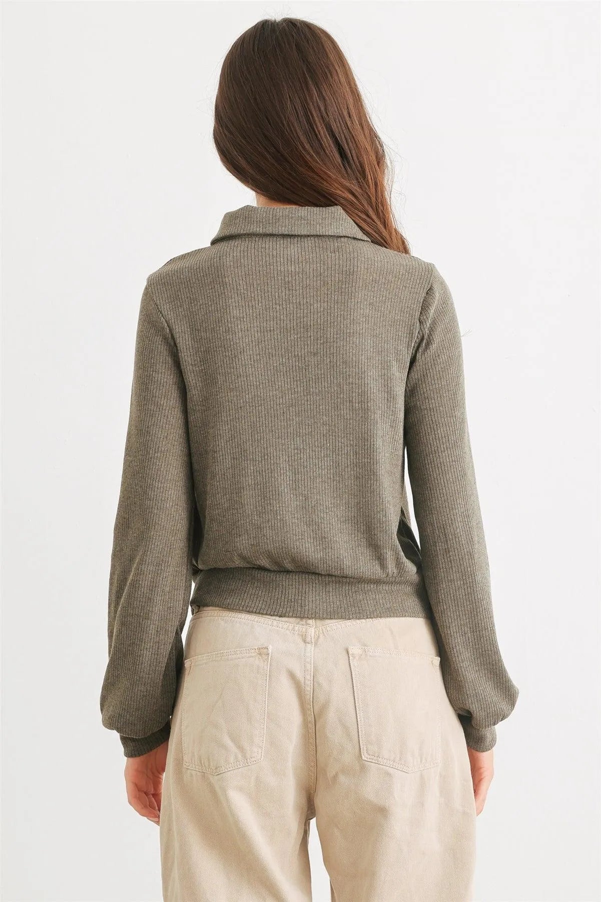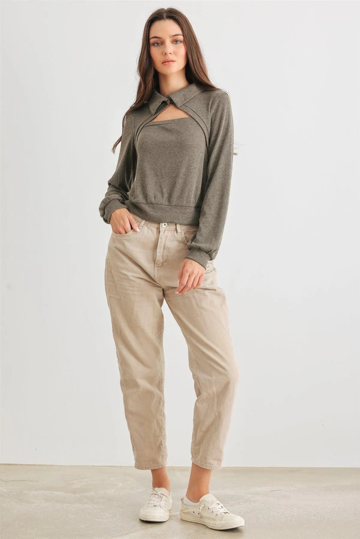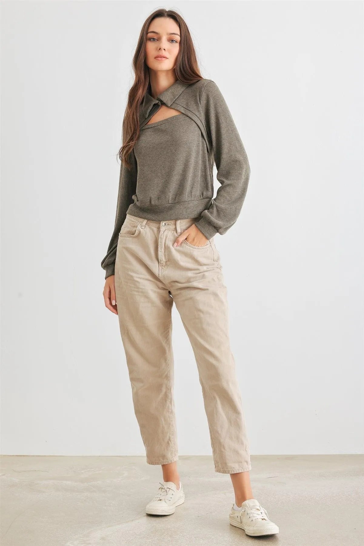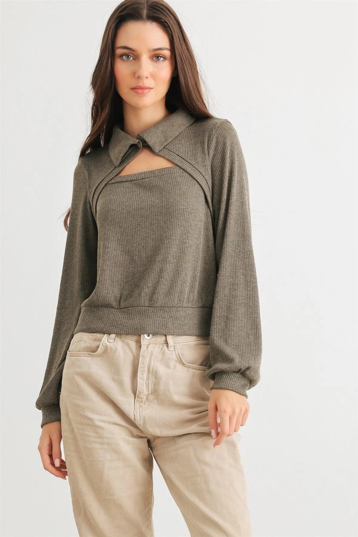 Olive Ribbed Cut-Out Front Collared Neck Long Sleeve Top /2-2-2