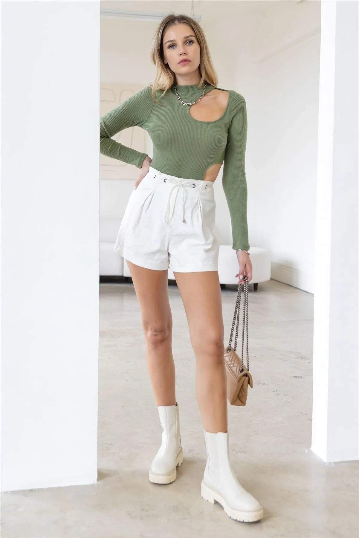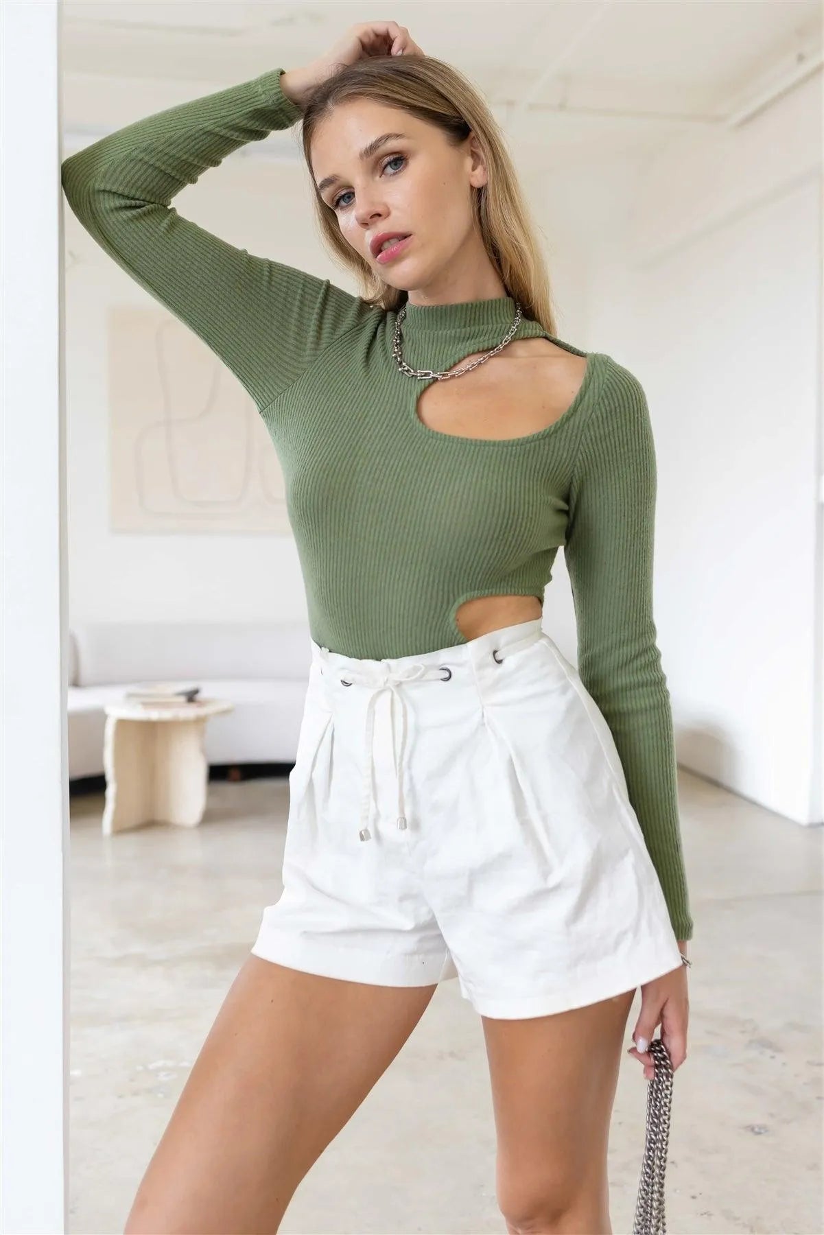 Olive Ribbed Mock Neck Cut-Out Long Sleeve Bodysuit /3-2-1