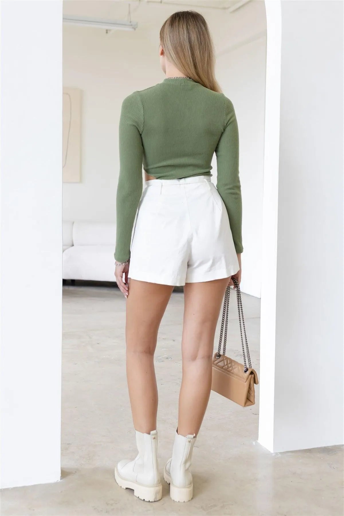 🖤 Item Features: Olive, ribbed, mock neckline, textured, solid color, long sleeves, cut-out details, long sleeves, thong double snap closure, slim fit, stretchy, not see through, unlined, casual, cute, stylish, trendy, soft to touch