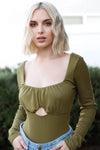 Olive Ribbed Square Neck Cut-Out Detail Long Sleeve Bodysuit /3-2-1