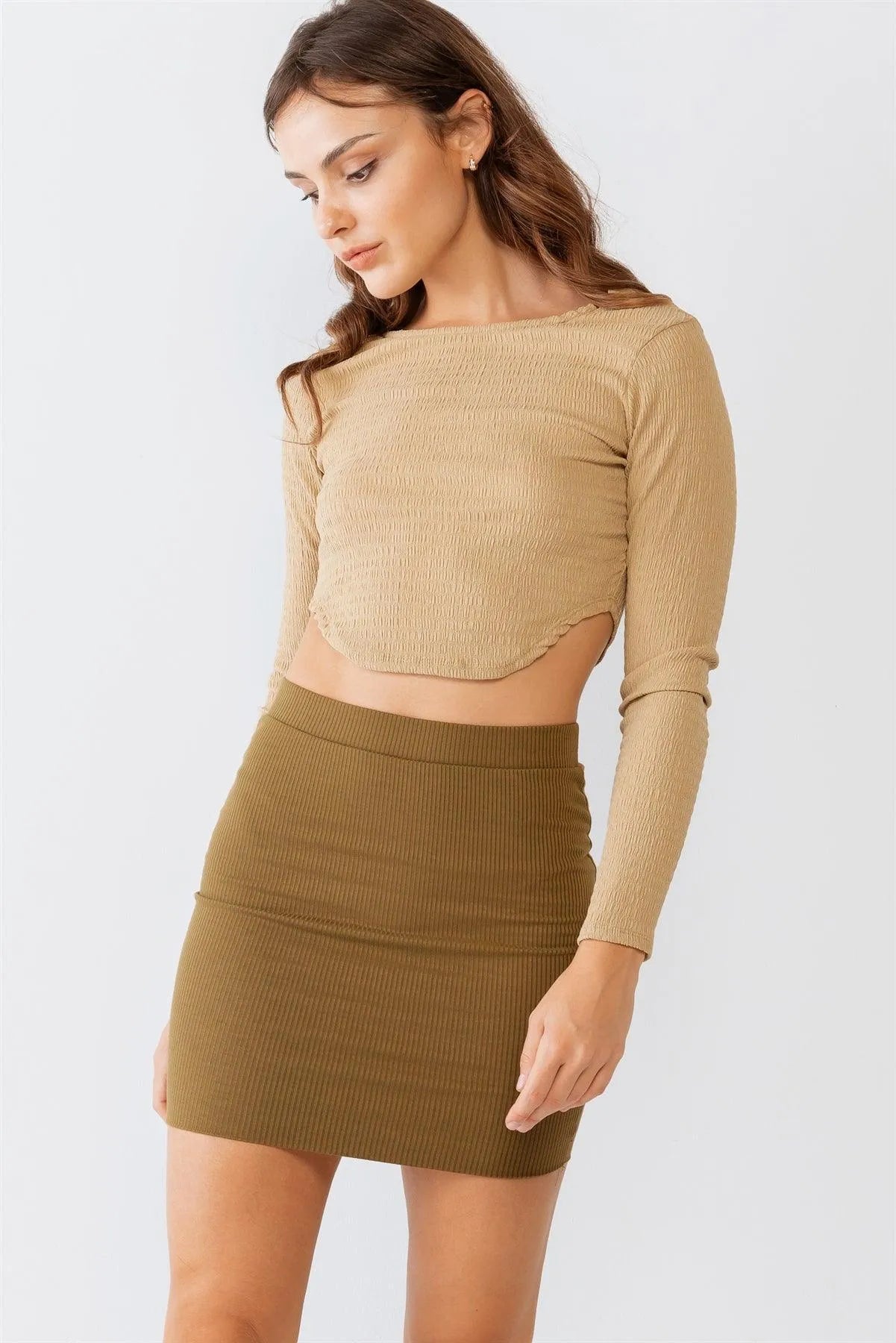 Olive Textured Curved Hem Long Sleeve Crop Top /3-2-1