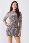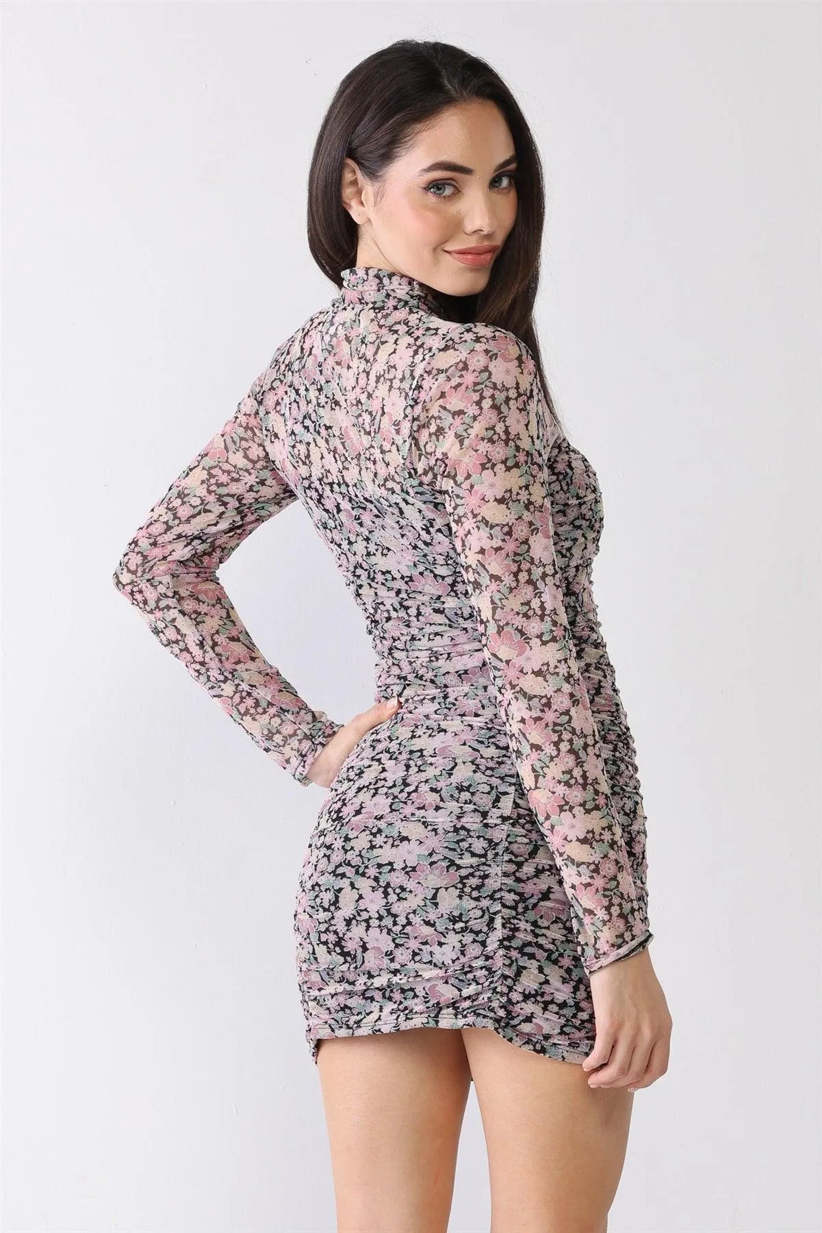 Pink Floral Print Mesh Ruched Mock Neck Long Sleeve Mini Dress /1-1-2-1