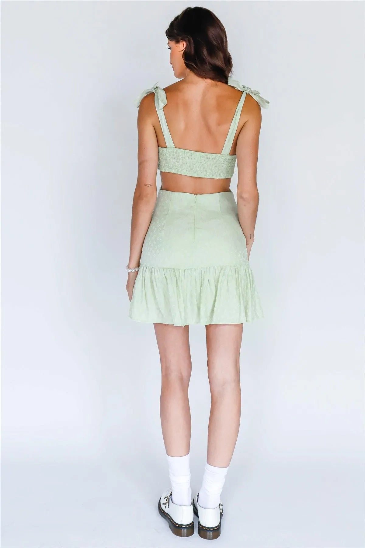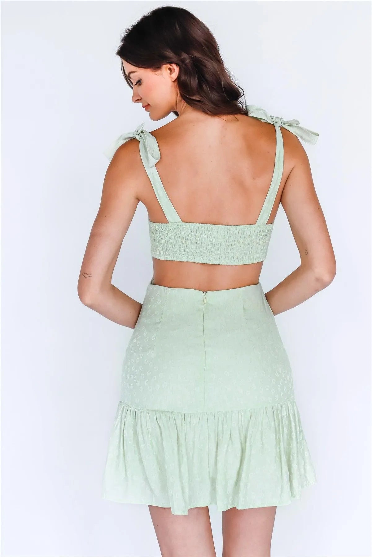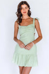 🖤 Item Features: Pistachio, geometric print, ruched front detail, sleeveless, strip self-tie details, open back, flare hem, zip-up back closure, mini length, lined, non-stretchy, non-sheer, cute, girlish, elegant, summer vibe, trendy, lifestyle, must-have