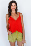 🖤 Item Features: Red, solid color, cotton & linen blend, front ruched detail, sleeveless, adjustable straps, contrast trim detail, v-neckline, relaxed fit, non-stretchy, unlined, non-sheer, casual, cute, trendy, stylish, must have