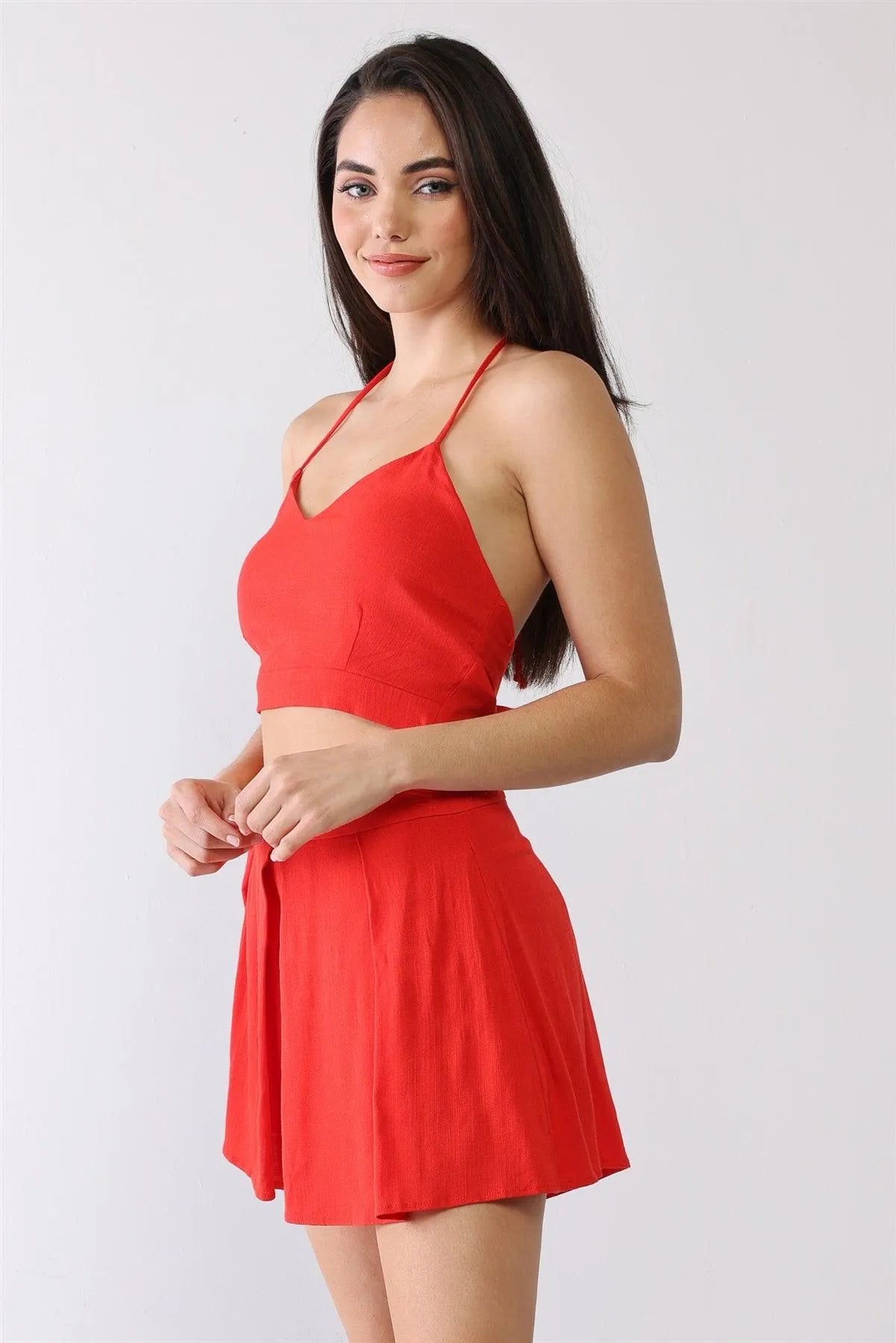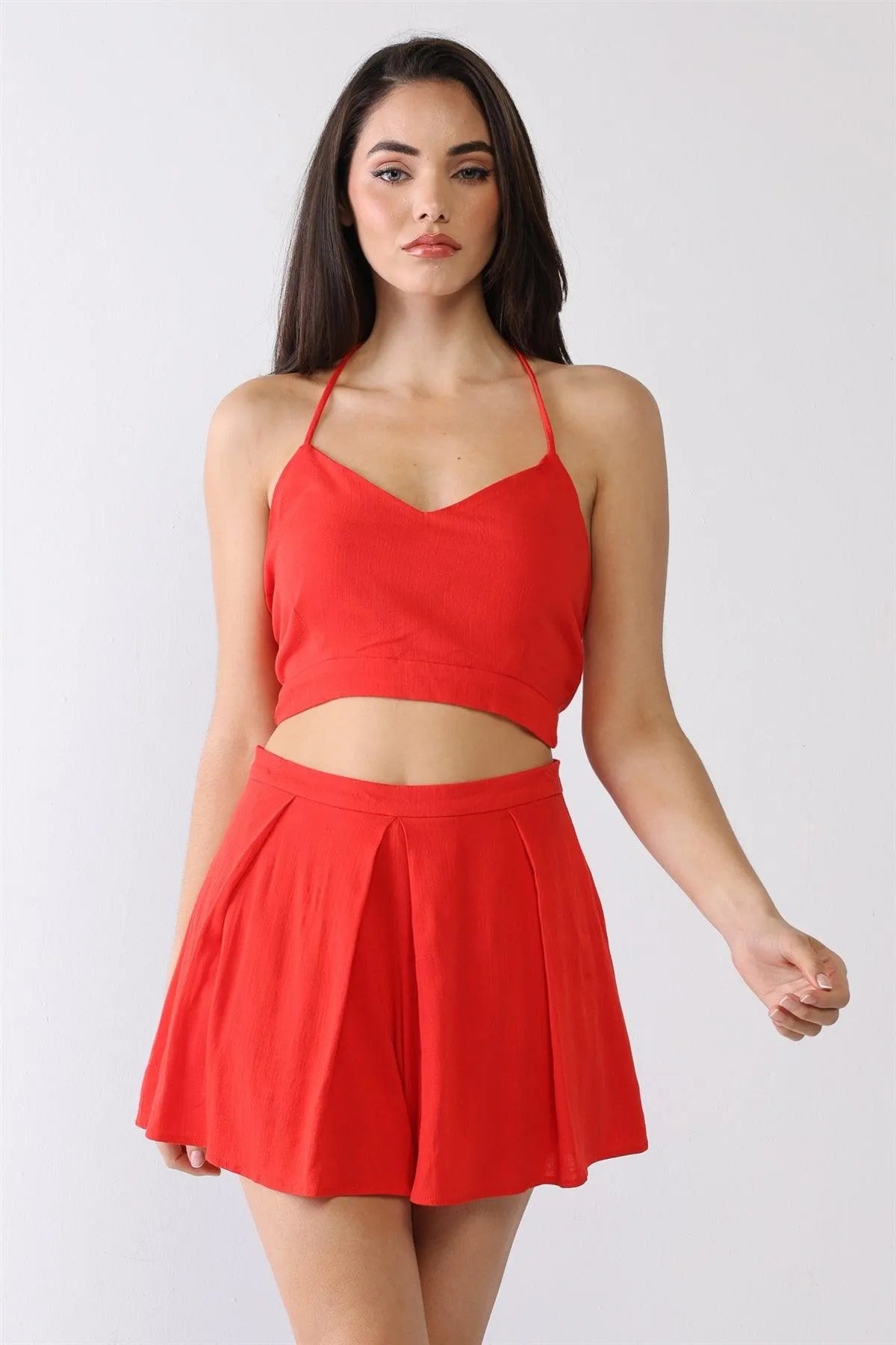 women skirt set: v-neckline, sleeveless, back self-tie, cropped length top, high waist, pleated, back hidden zip-up closure, lined shorts, non-stretchy, lined, not see through, casual, cute, girlish, must-have this sexy set!