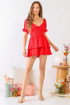 Women romper :Red, solid color, smocked, tired, shape heart neckline, short sleeves with ruffle, front bow, semi-stretchy, lined, non-sheer, cute, trendy, lifestyle, sexy dress for night out!