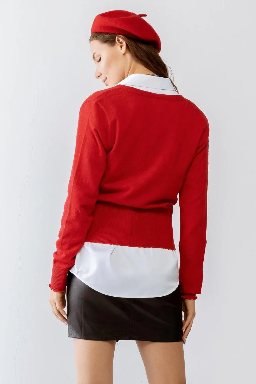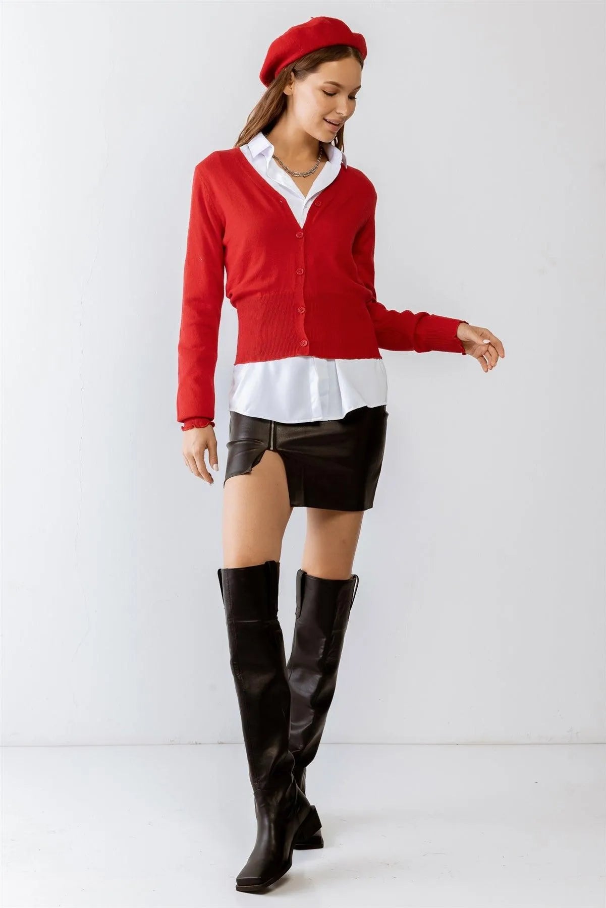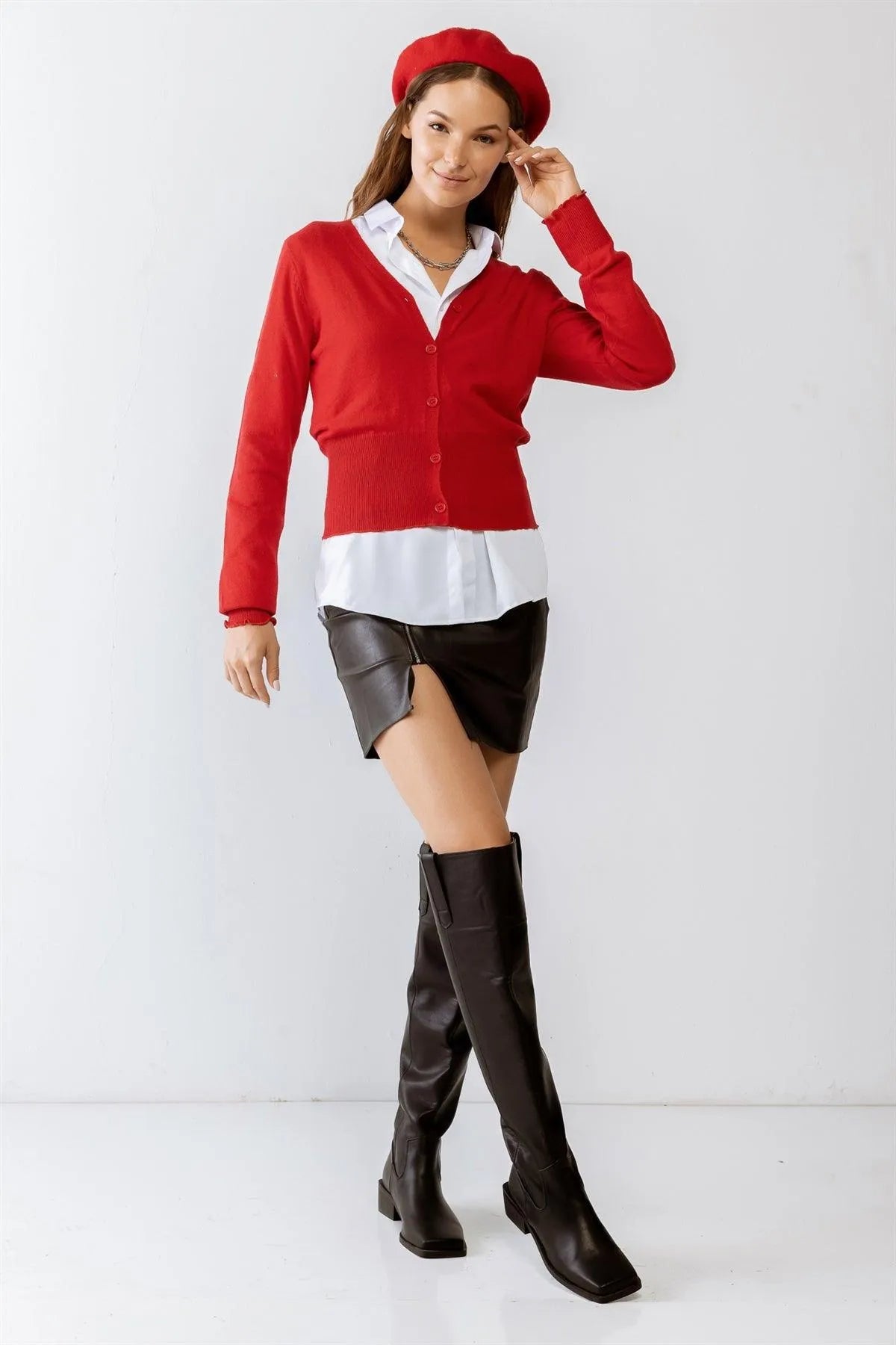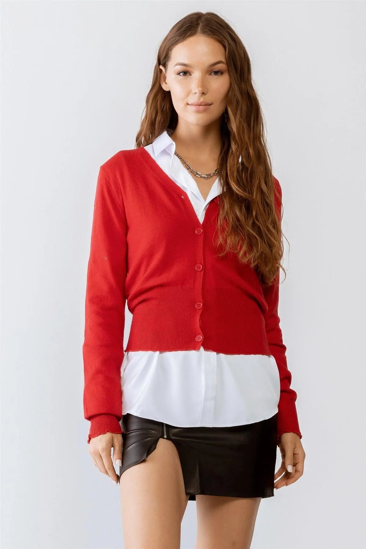 Red Stitch Detail Button-Up V-Neck Long Sleeve Sweater /3-2-1
