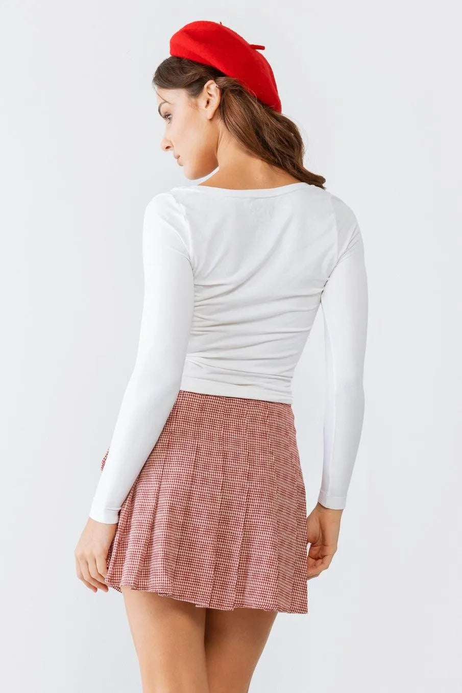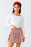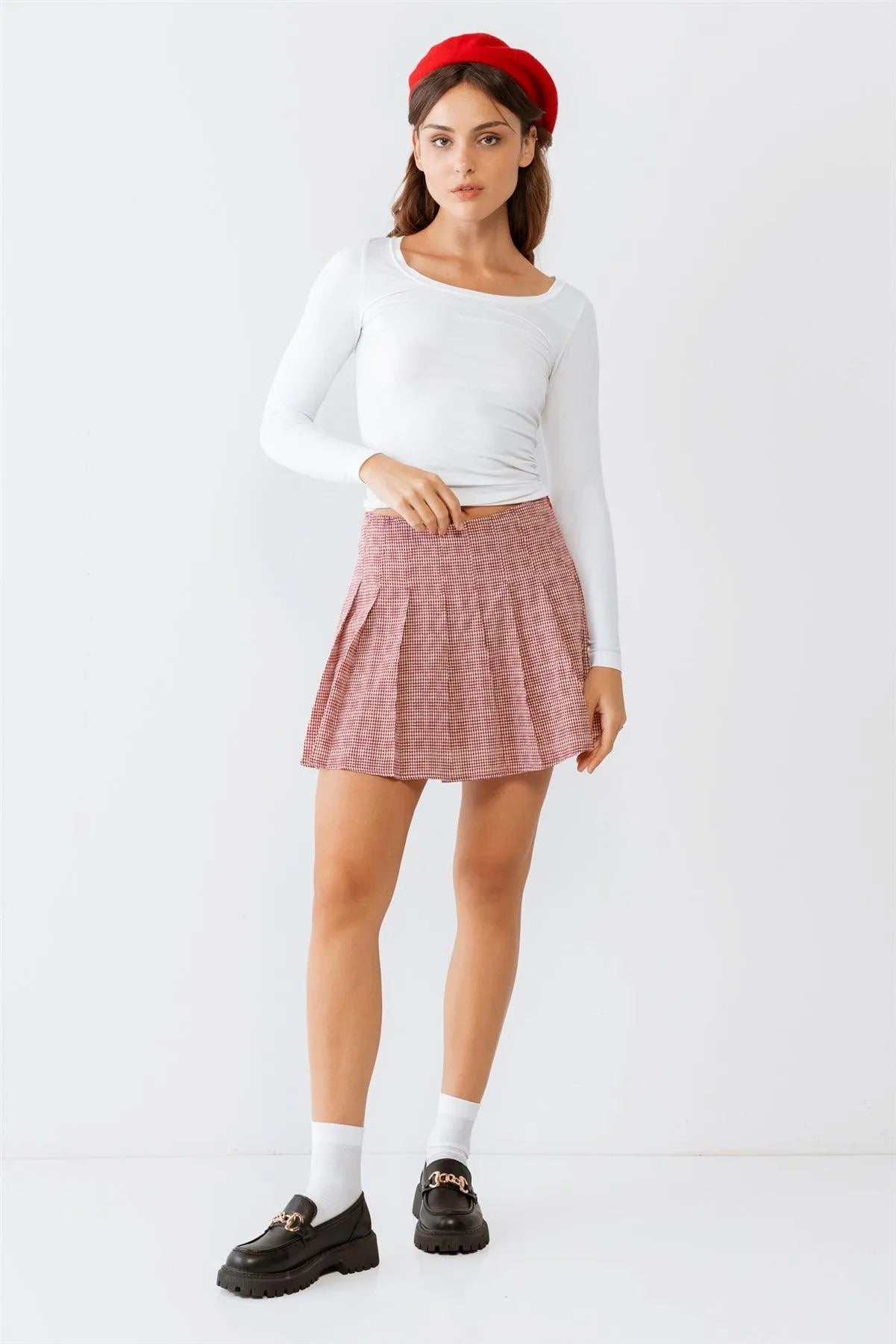 Red & White Plaid Pleated Cotton High Waist Mini Skirt /2-2-1