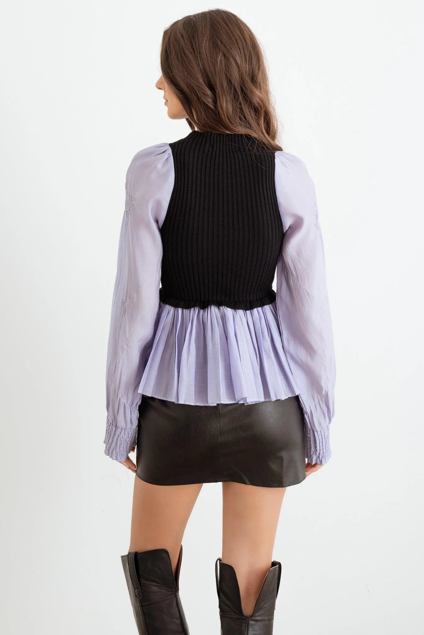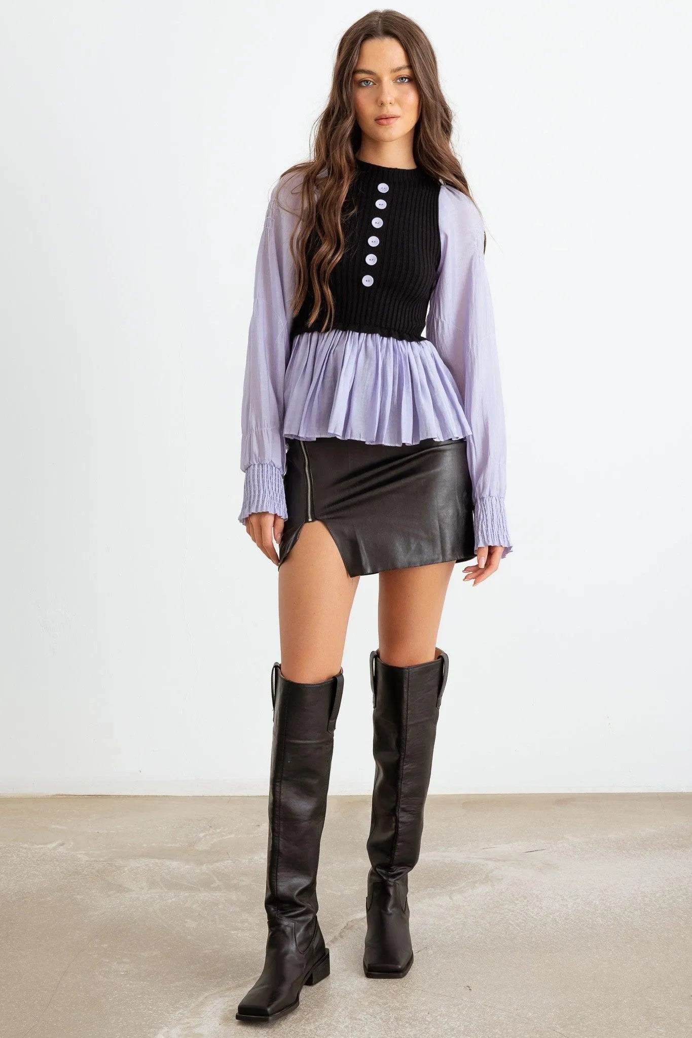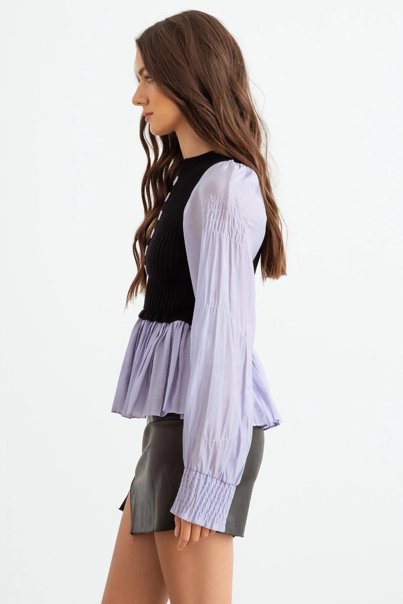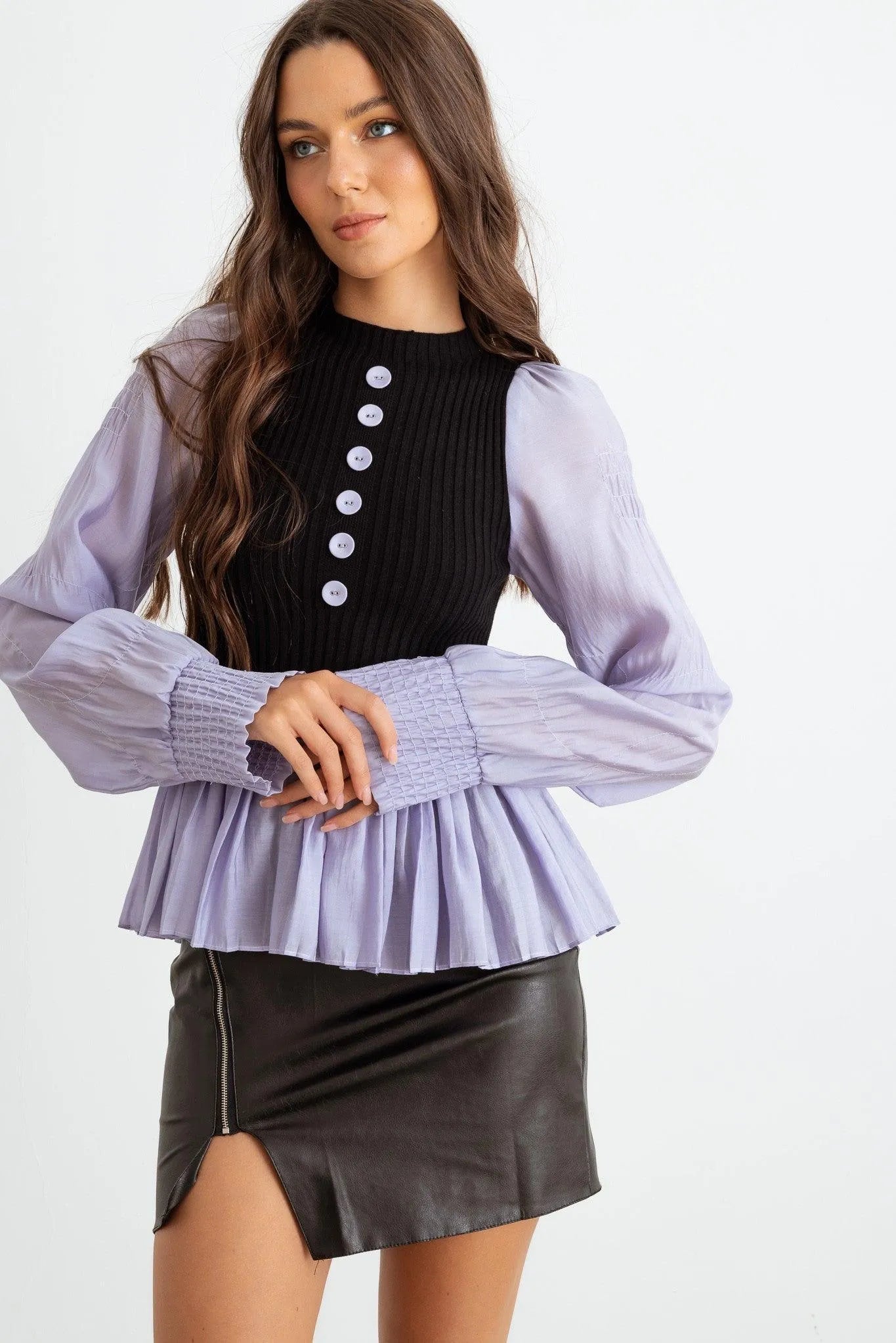 🖤 Item Features: Lilac & black ribbed knit material, viscose blend, contrast front buttons, long sleeves with smocked cuffs, crew neckline, flare pleated hem, shirt style, semi-stretchy, non see through, unlined, girlish, cool, elegant, cute, great for the office.