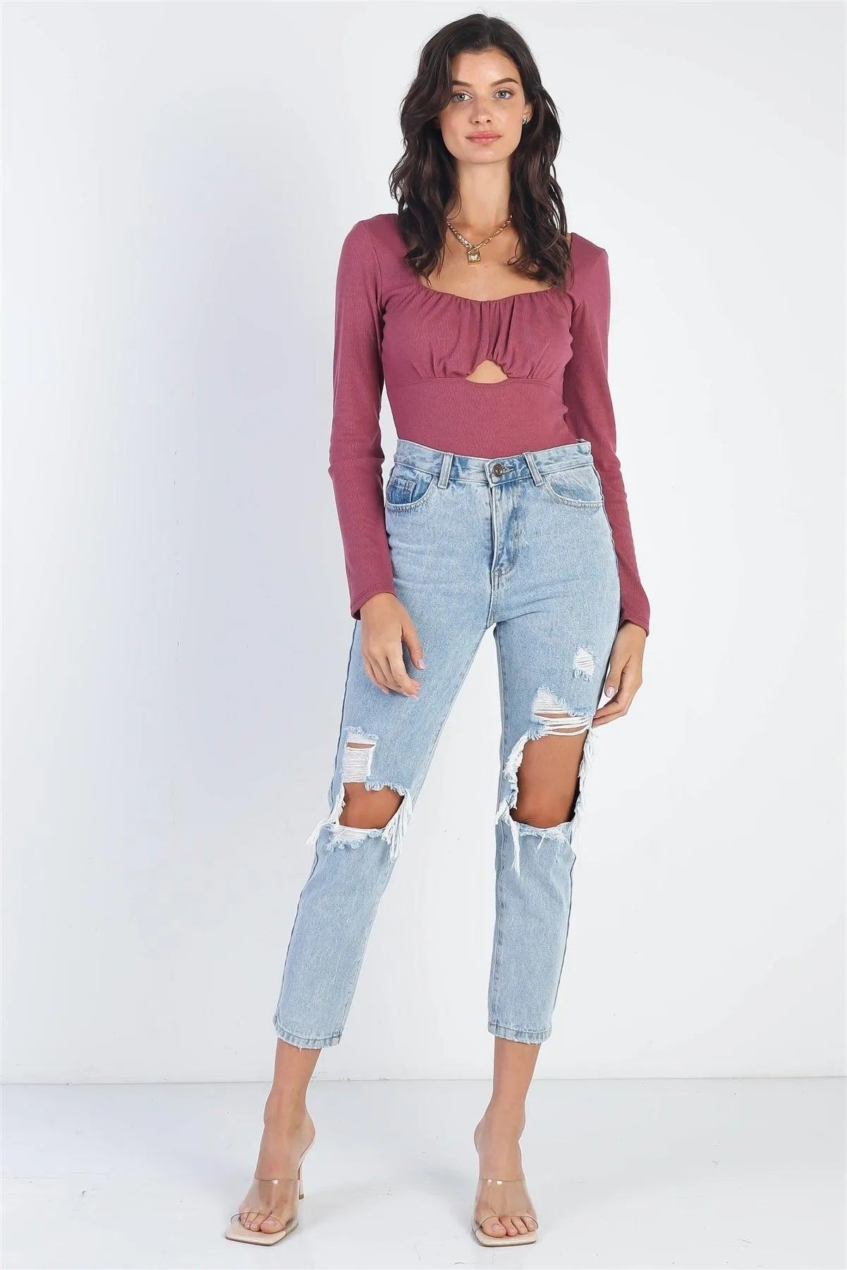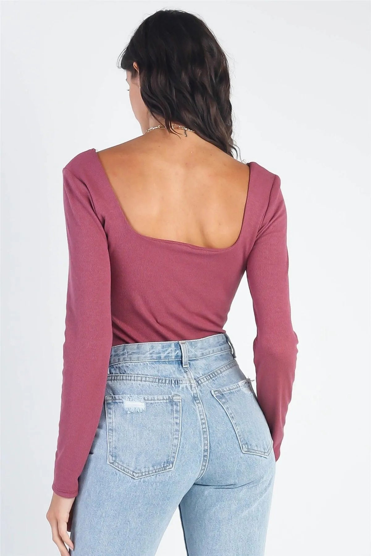 Plum Ribbed Square Neck Cut-Out Detail Long Sleeve Bodysuit /3-2-1