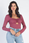 🖤 Item Features: Plum, solid color, ribbed texture, square neckline, front bustier cut-out detail, long sleeves, thong double button closure, slim fit, semi-stretchy, unlined, trendy, stylish, casual, elegant, must have