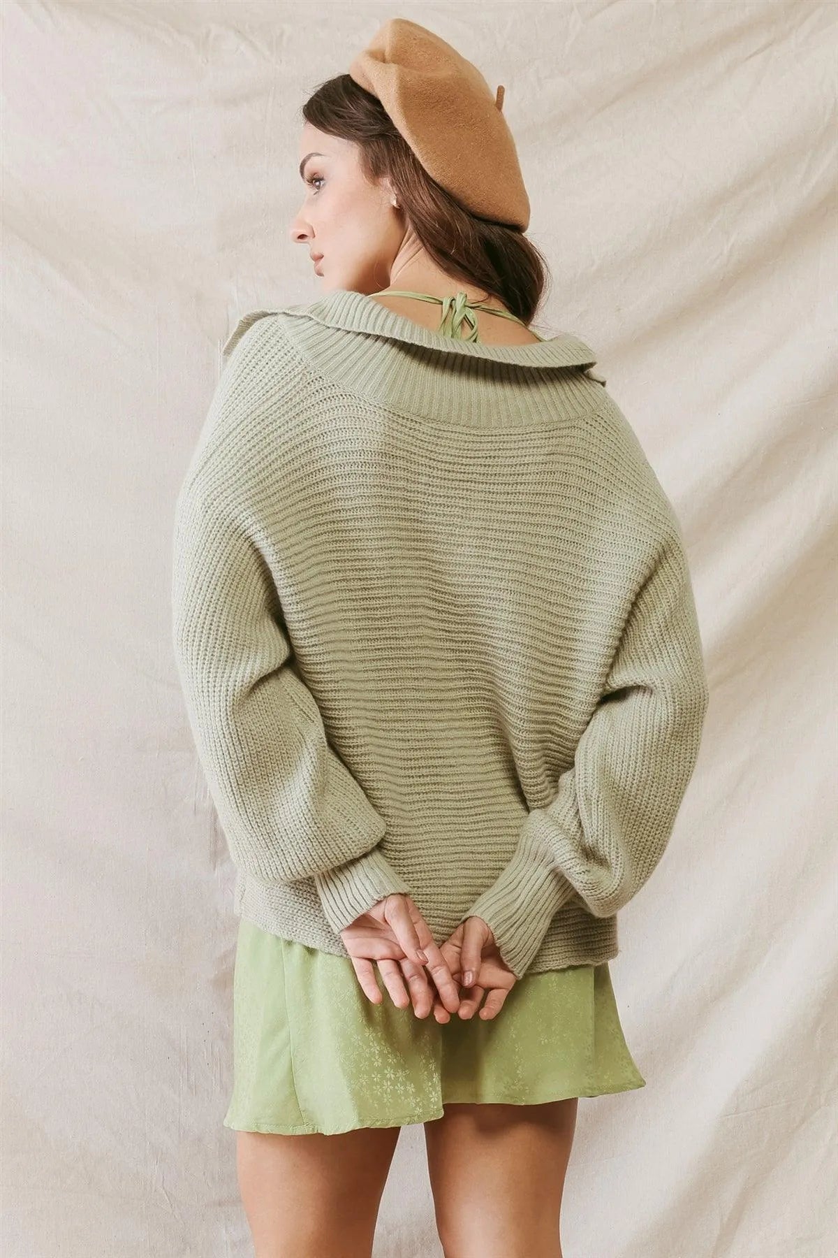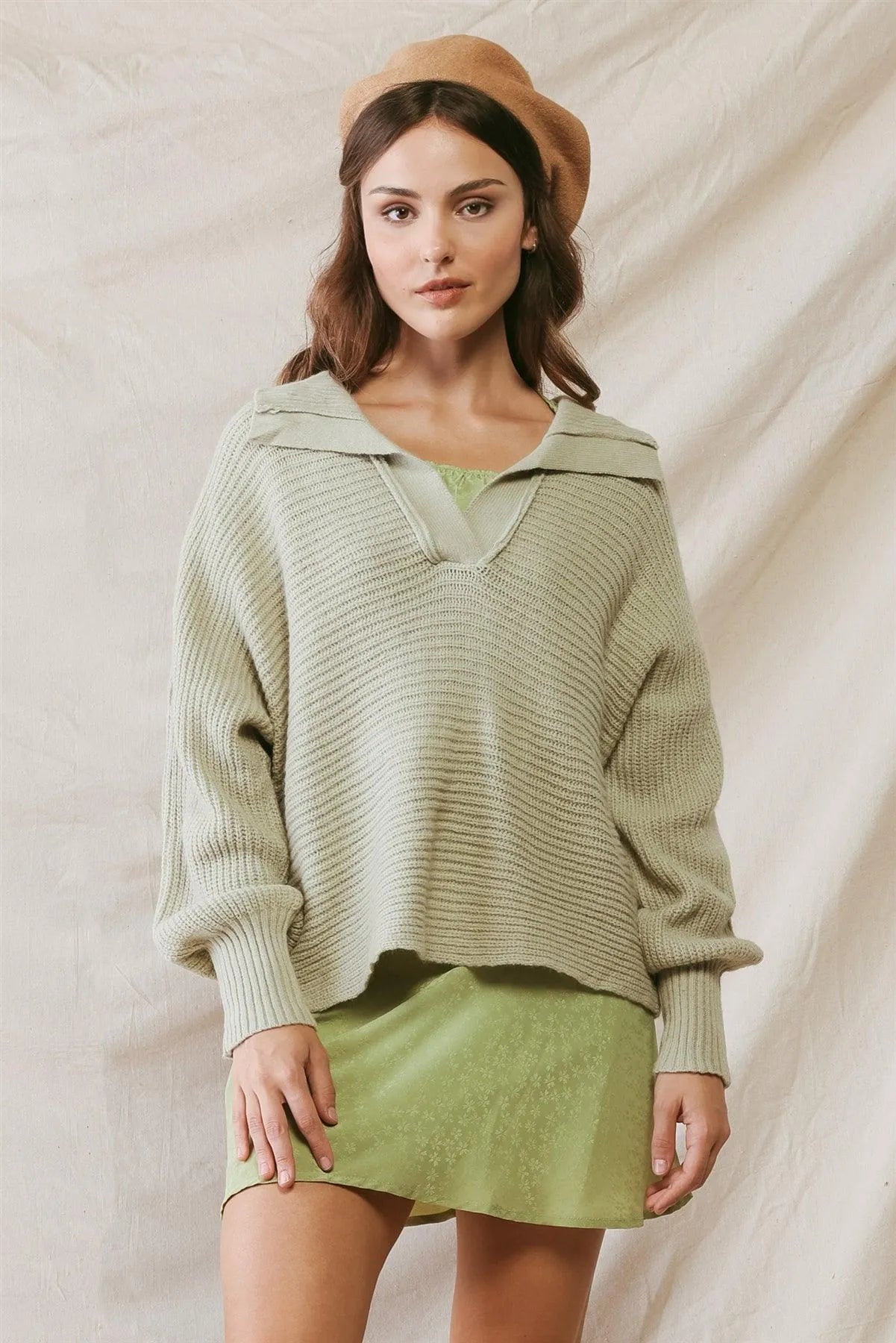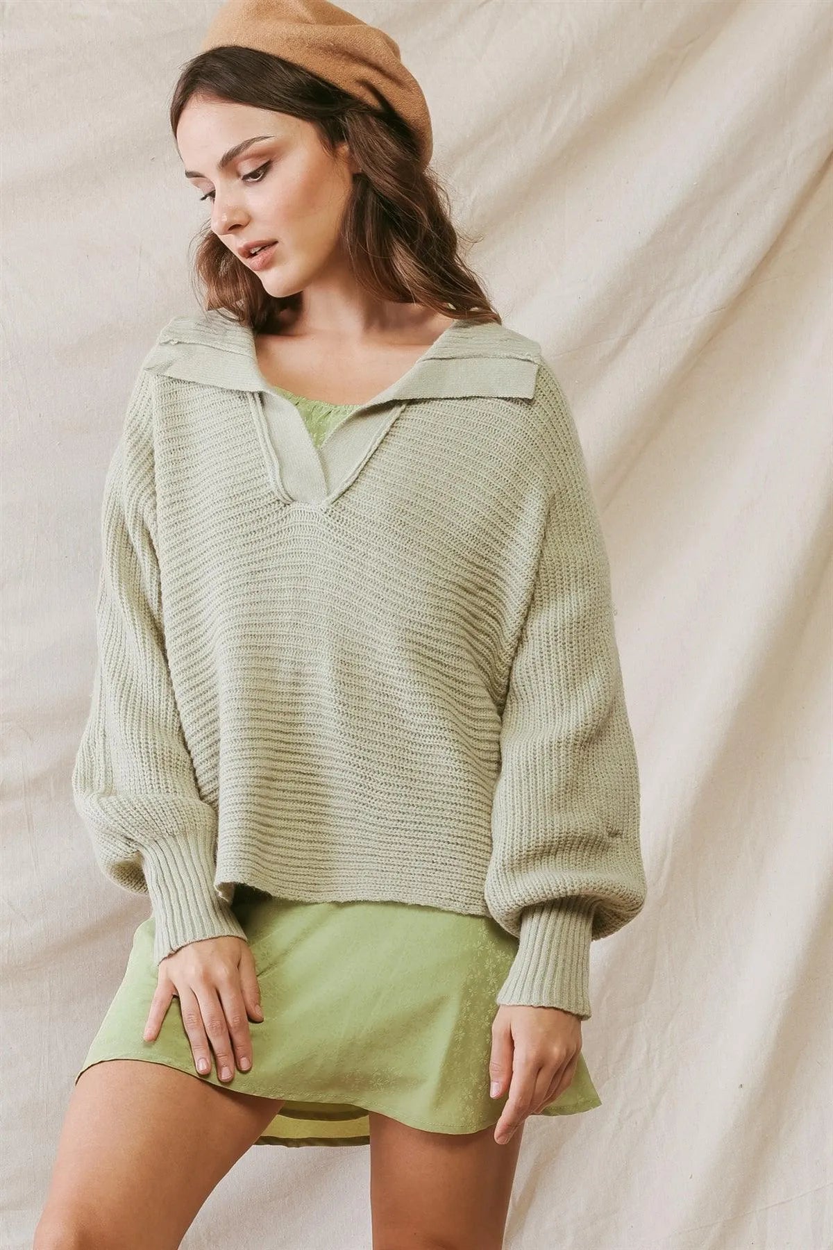 Sage Knit Collared Long Sleeve Cropped Sweater /2-2-2