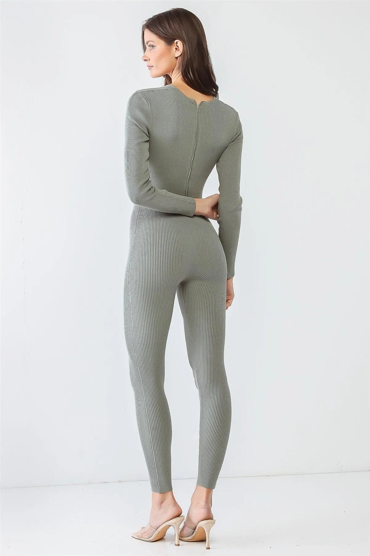 Sage Ribbed U-Shape Neck Back Zip-Up Stretchy Jumpsuit /3-2-1
