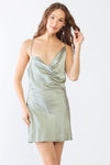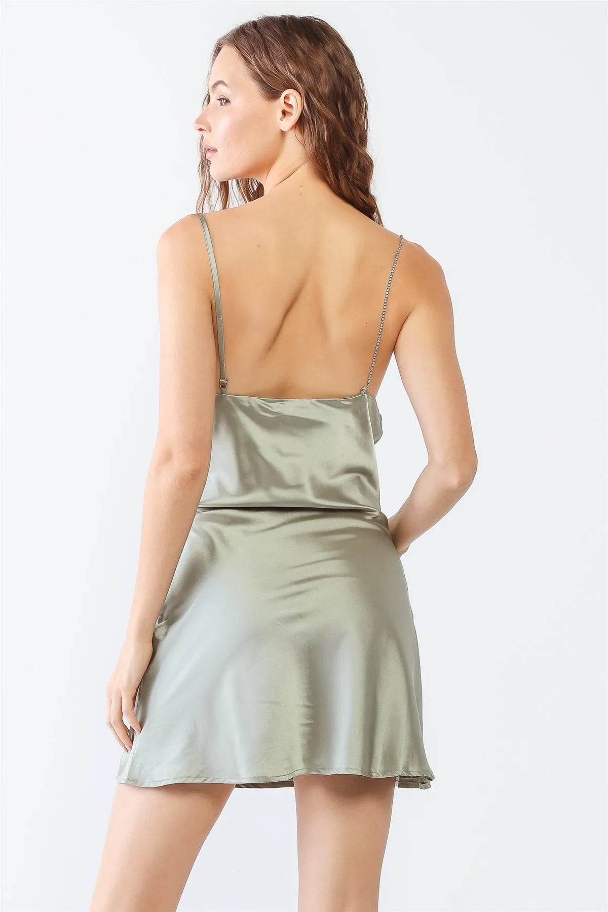Women dress, solid color, 1satin effect, solid color, cowl neckline, sleeveless, one rhinestone strap, one adjustable strap, mini length, non-stretchy, lined, not see through, cute, girlish, hot sexy dress for a hot sexy night!
